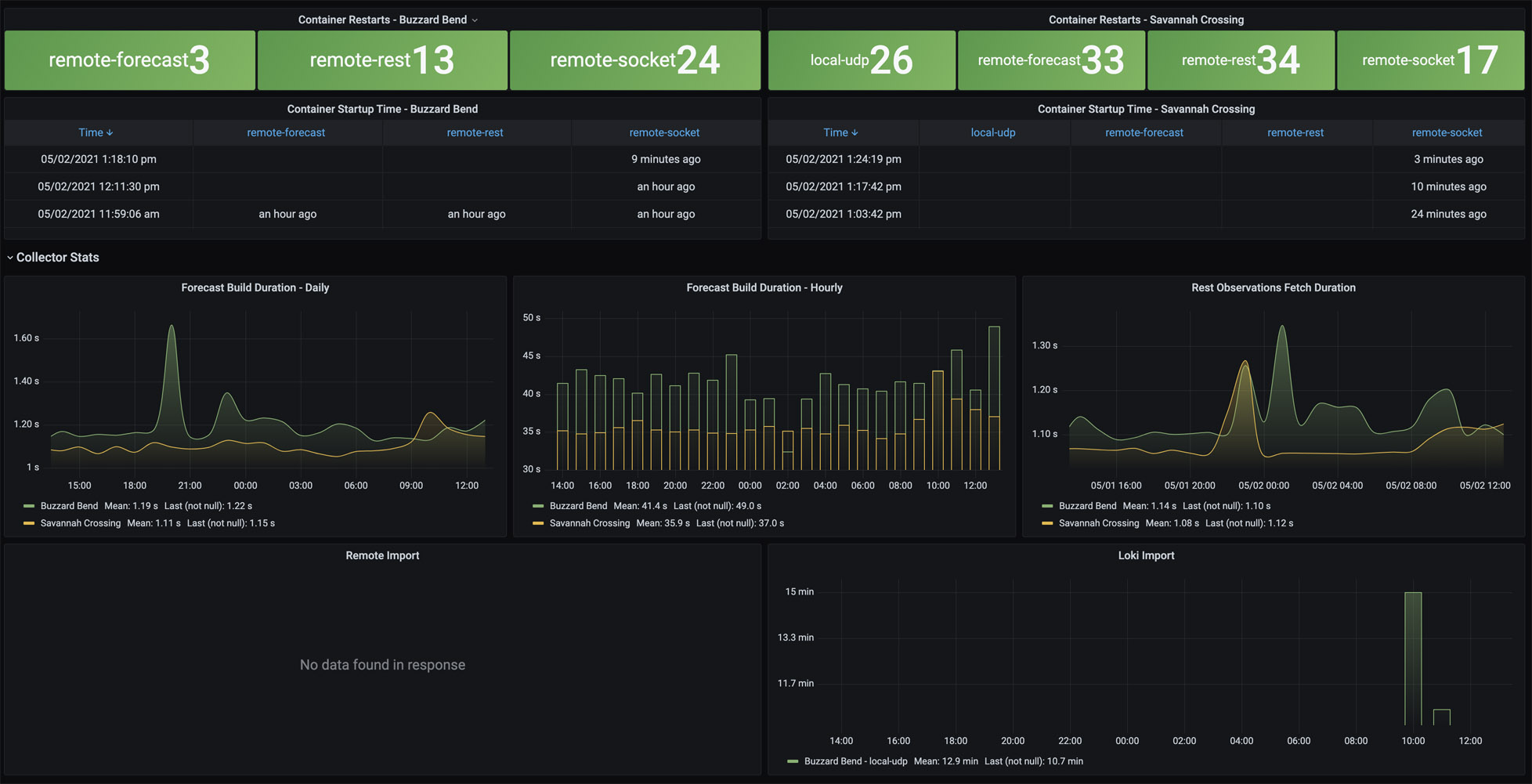- Forecast Build Duration - Hourly - between 30 and 45 seconds (note - if this takes longer than 60 seconds, the Docker Health Check will currently recycle the container.