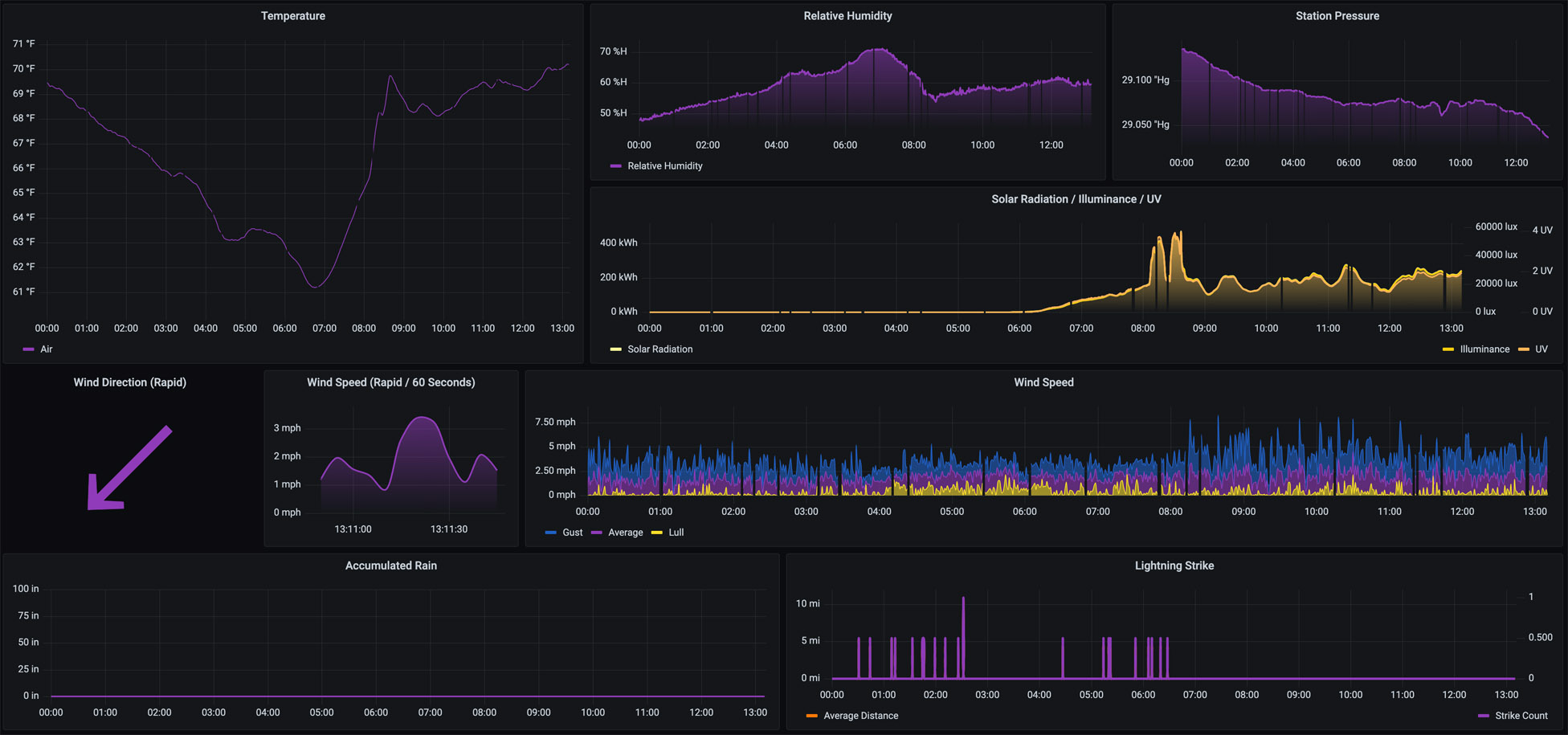 The dashboard provides for Temperature, Relative Humidity, Station Pressure, Accumulated Rain, Solar Radiation, Illuminance, UV, Lightning Strike, and Wind Speed from midnight to the current time. These reflect the direct measurements from the local-udp collector (or imported from WeatherFlow).
