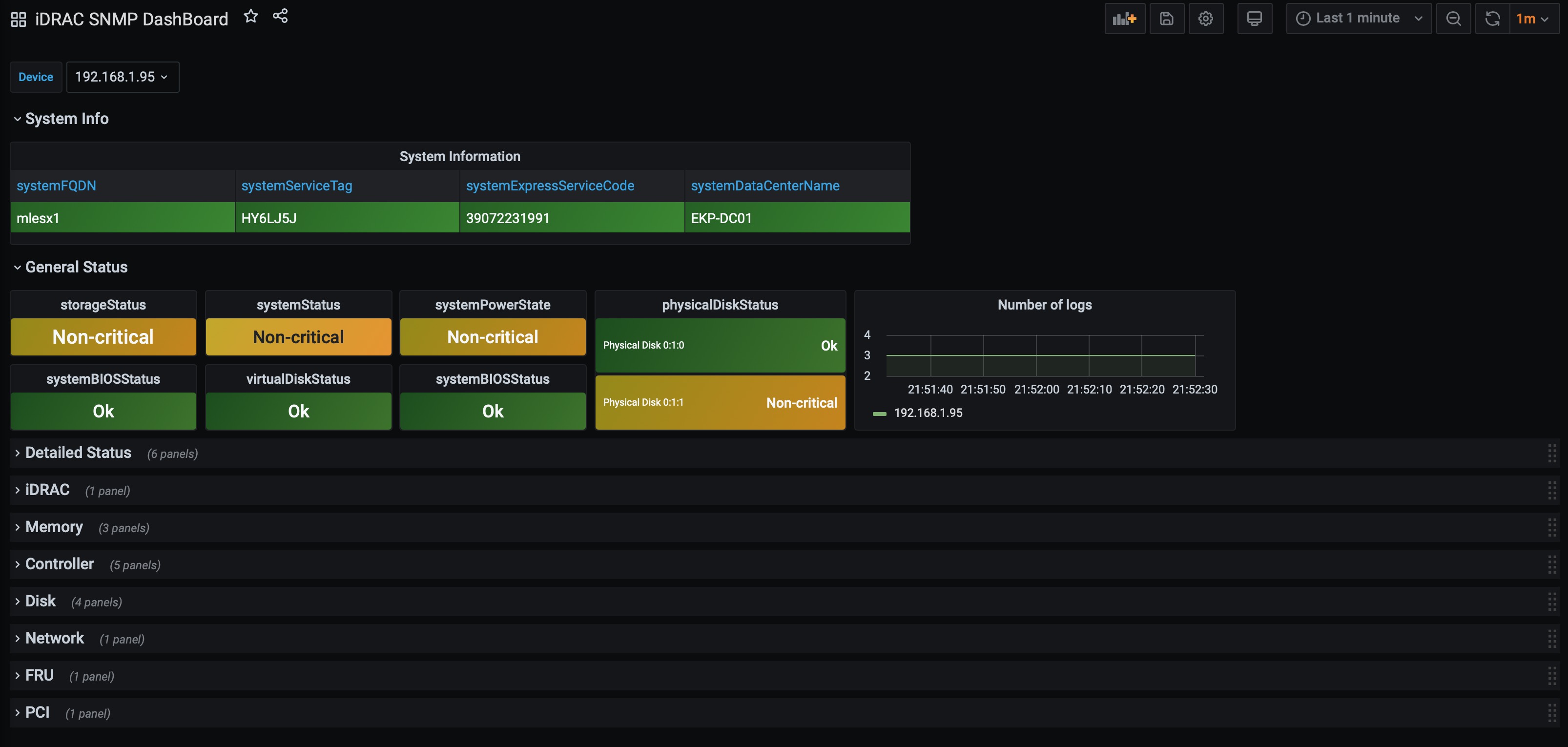 A Dashboard for Dell iDRAC Shows Hardware status for: Storage, Disks, memory, controller, BIOS, Network, PCI, Power and iDRAC. Also shows some Hardware information such as: FQDN, ServiceTag, ServiceCode, FRUs