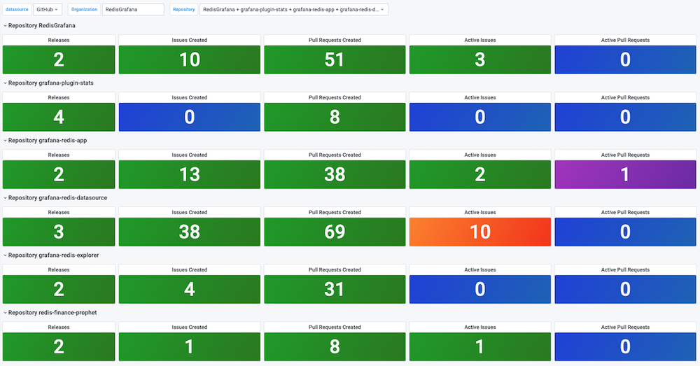 This dashboard provides PR and Issues across multiple repositories in the Organization using GitHub data source: