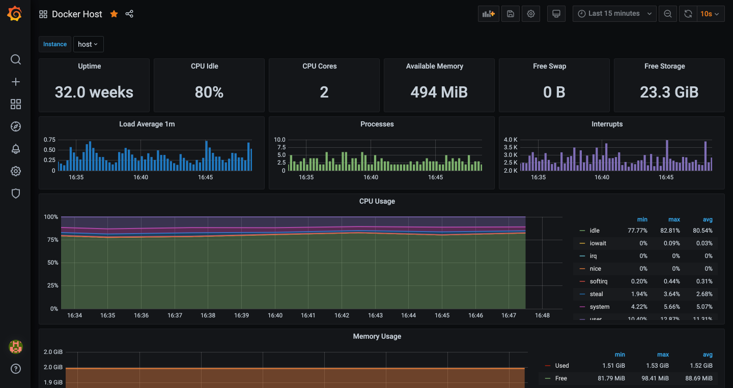 The DockProm Host dashboard uses the prometheus data source to create a Grafana dashboard with the graph and singlestat panels.