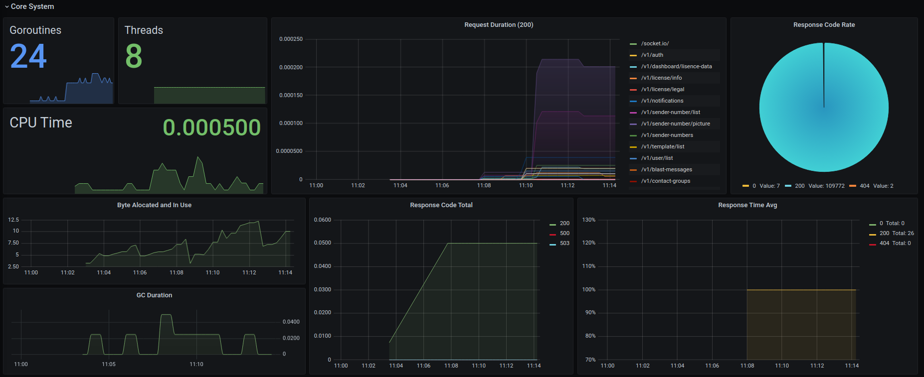 The Wappin Go Backend dashboard uses the prometheus data source to create a Grafana dashboard with the graph, piechart, stat and timeseries panels.