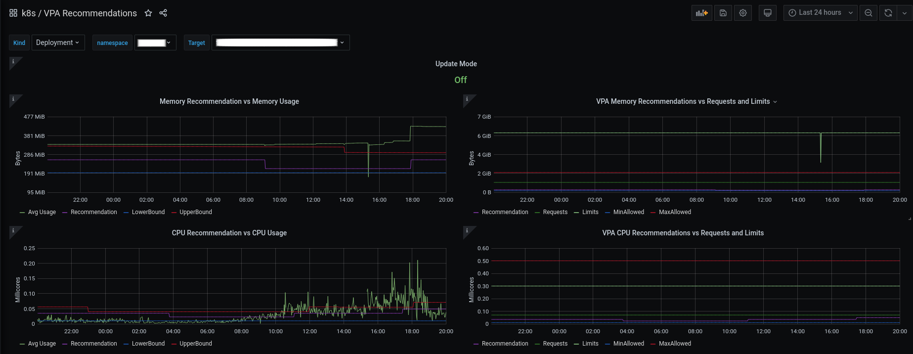 Uses Prometheus datasource to get VPA metrics (lowerBound, upperBound, target, minAllowed, maxAllowed, update_mode) and average pod resources usage (cpu, memory).