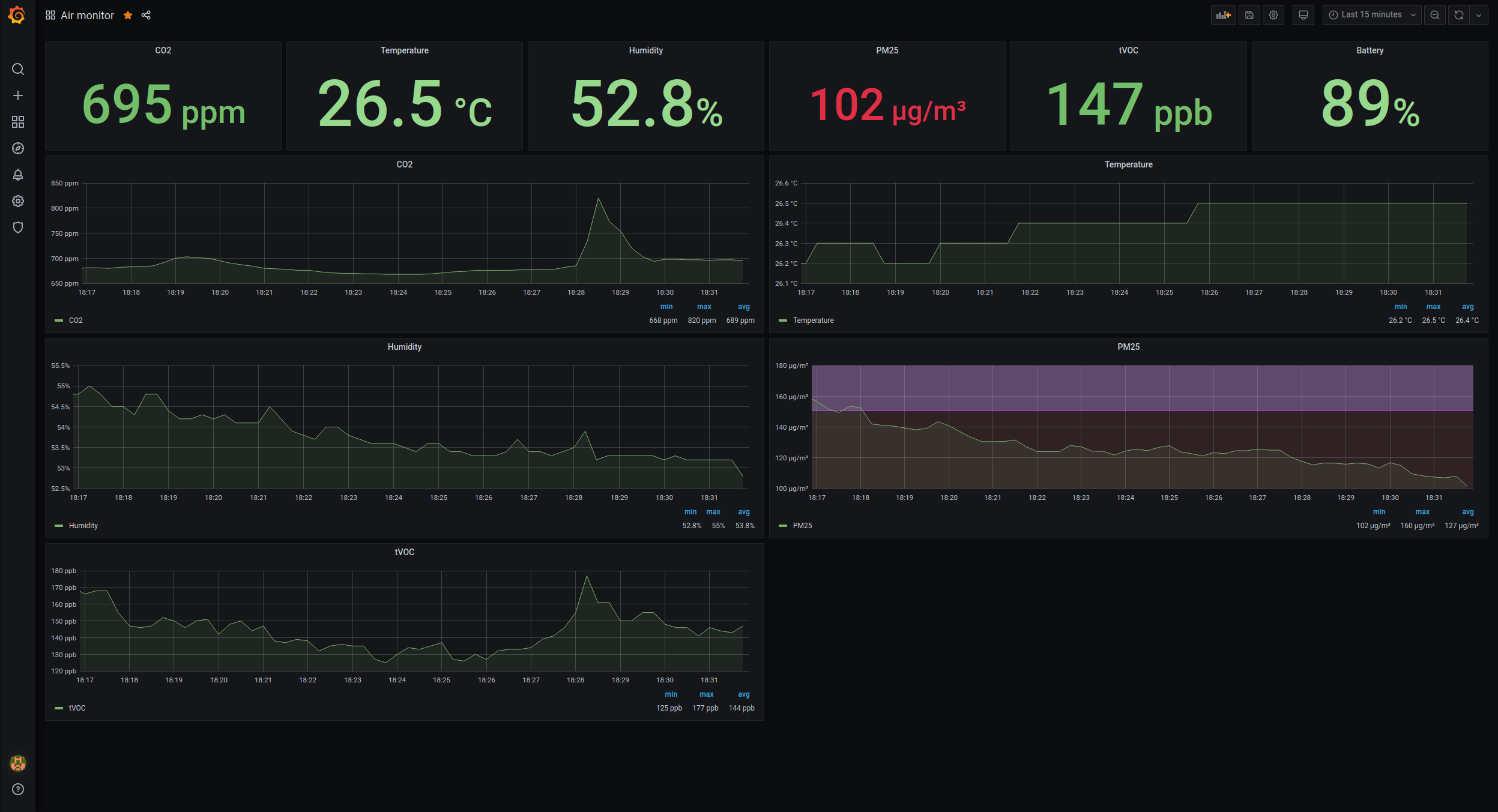 The Air monitor (ClearGrass) dashboard uses the prometheus data source to create a Grafana dashboard with the graph and stat panels.
