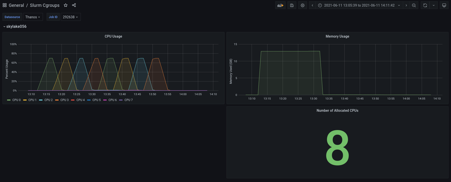 - Per-CPU usage: When there are multiple jobs running on a single node, this dashboard visualizes only CPUs utilized by a given job on that node.