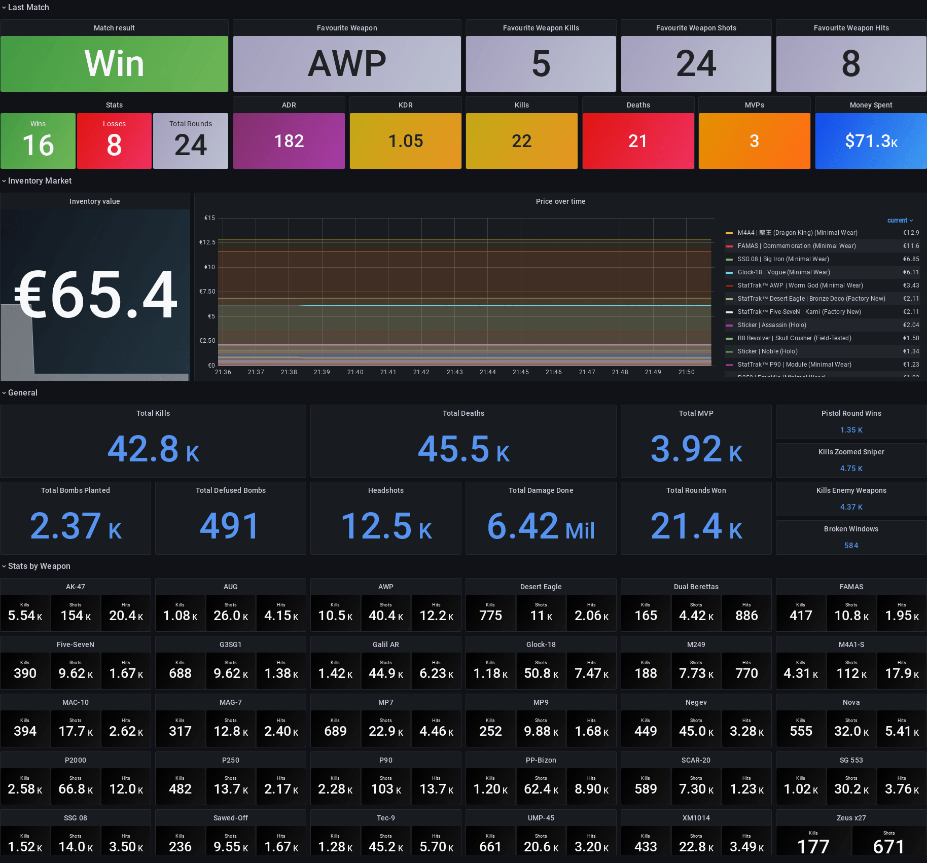 This dashboard is meant to be used with the Prometheus csgo_exporter.