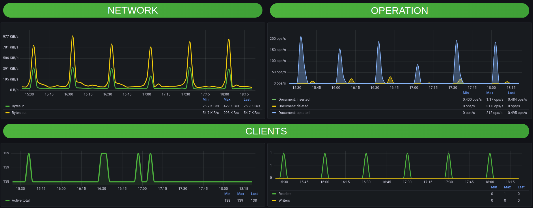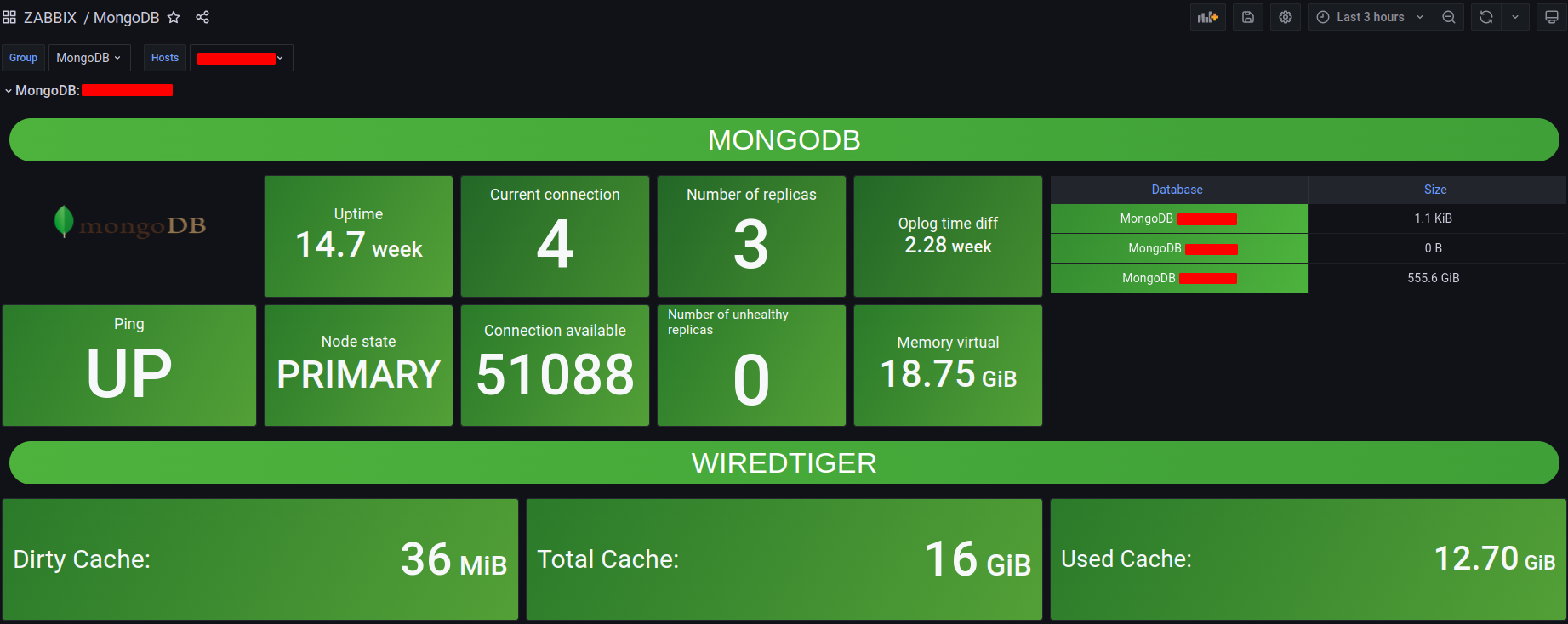 Example of MongoDB database dashboard monitored through Zabbix