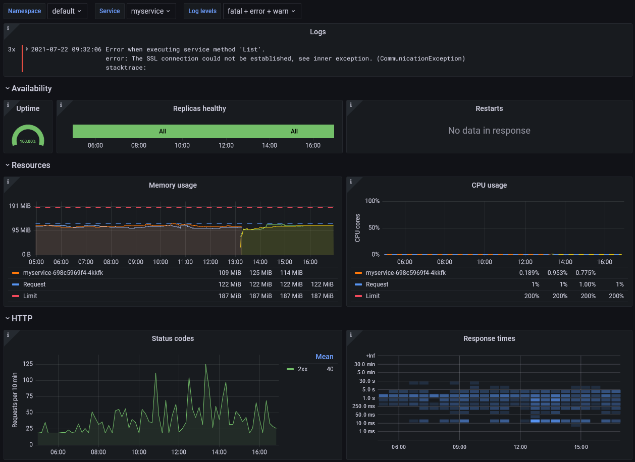 Simplifies monitoring services on Kubernetes. Shows container logs, availability, resource usage and HTTP and gRPC traffic.