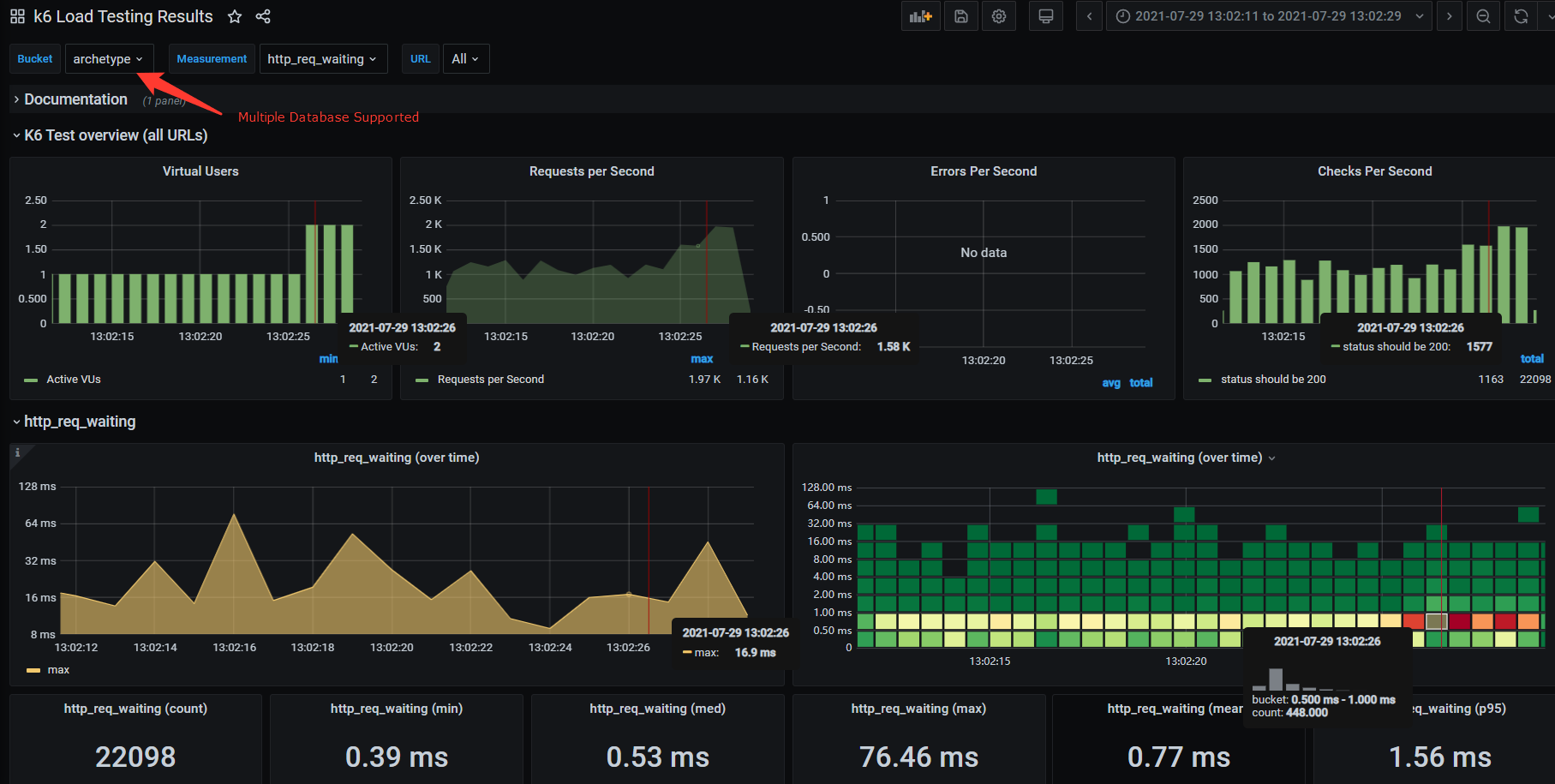 Based on https://grafana.com/dashboards/4411 A dashboard for visualizing results from the k6.io load testing tool, using the InfluxDB exporter. "Bucket" variable added to select from listed db of InfluxDB