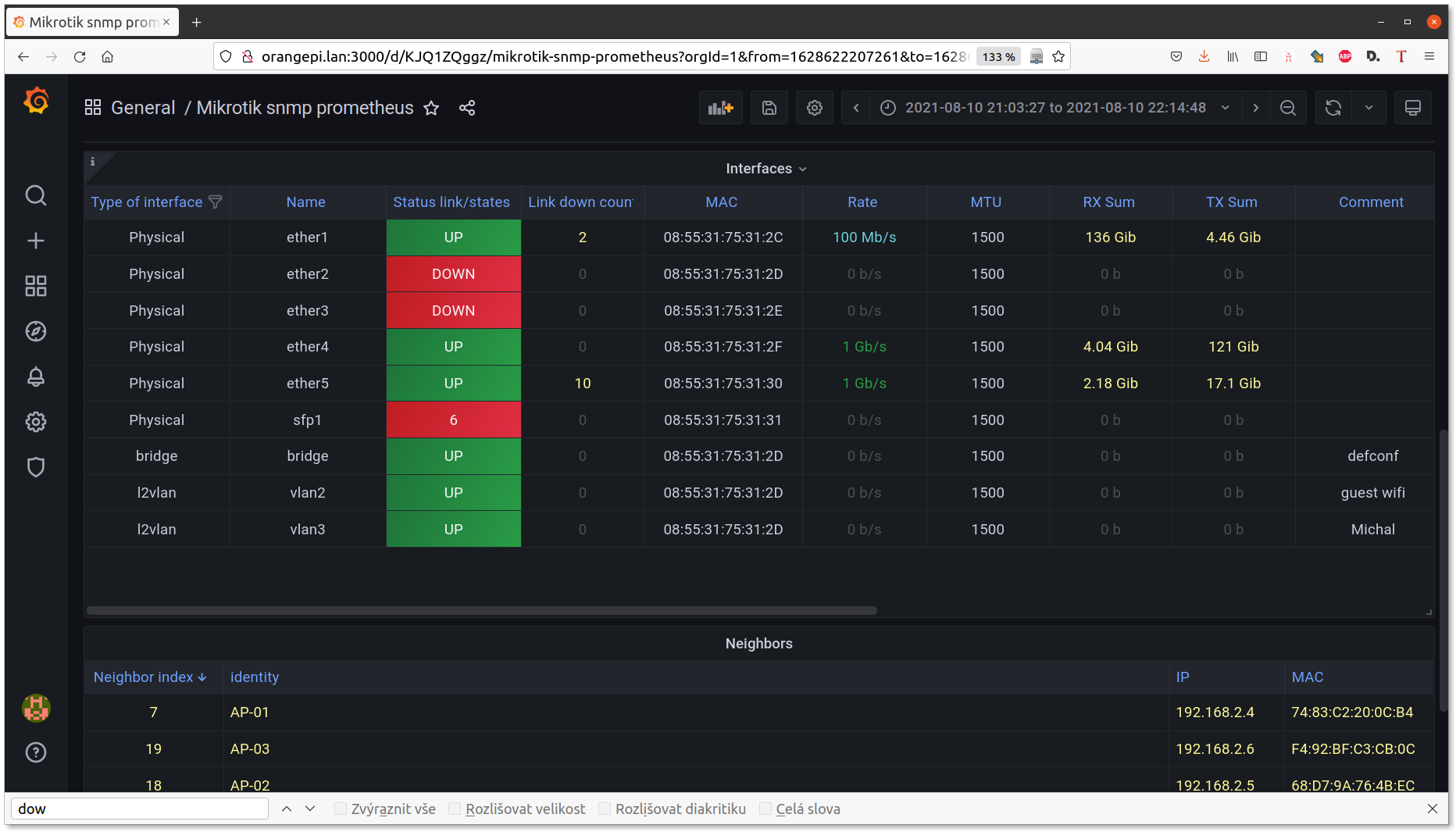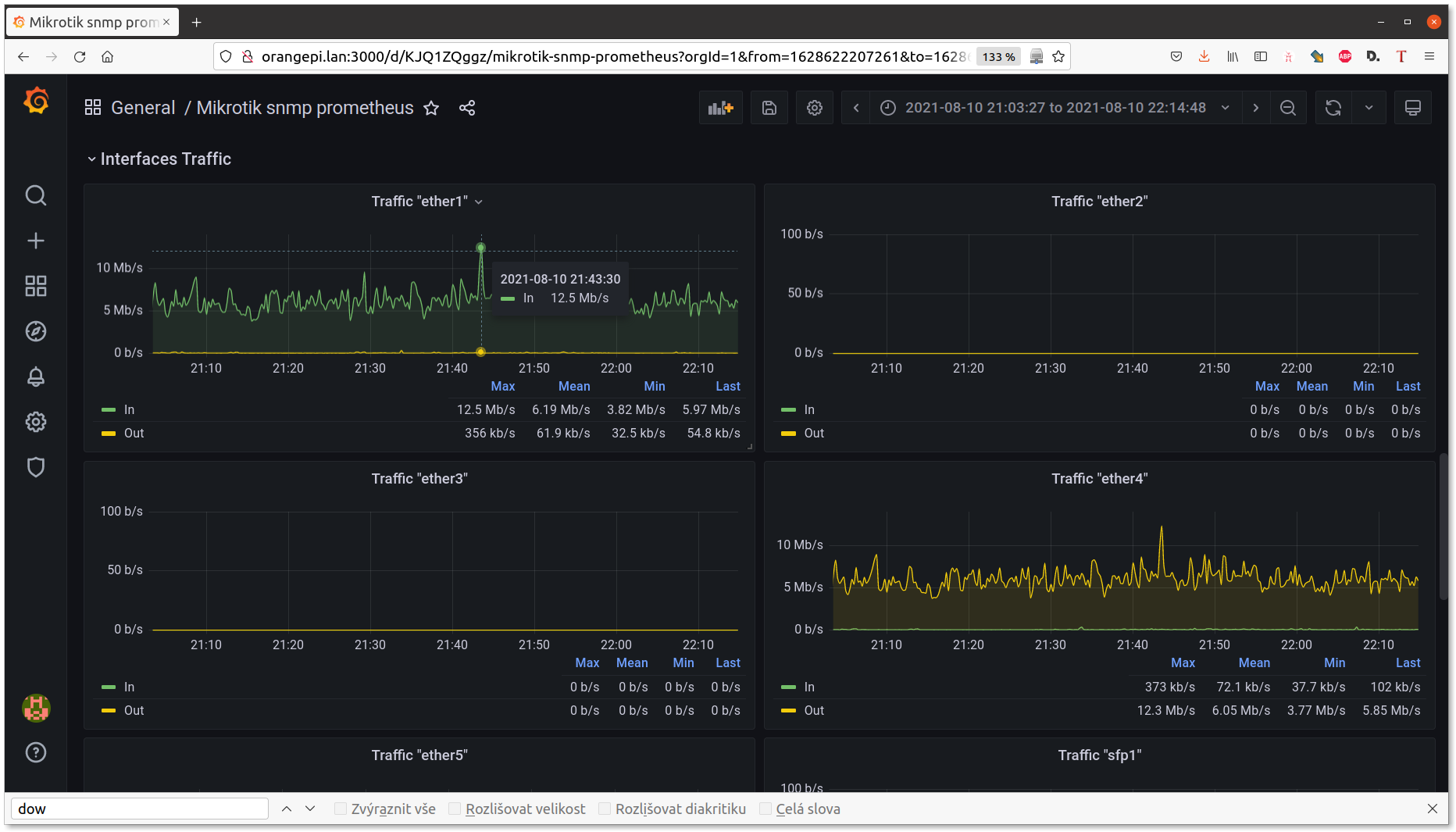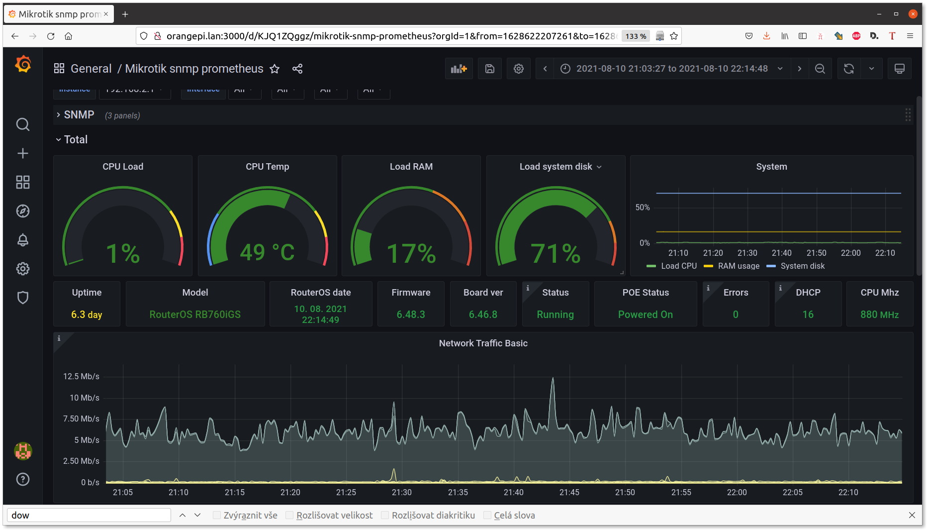This dashboard is based on ID 14420. It is a matter of simplification and clarity. It depends on Prometheus and SNMP Exporter https://github.com/prometheus/snmp_exporter In order for the data to be complete, it is necessary to write "params: module: [mikrotik]" in the Prometheus target config. Tested on MikroTik RB760iGS hEX S and Orange Pi Plus R1 with Docker. Last version compatible with snmp-exporter v0.23.0 / 2023-07-20