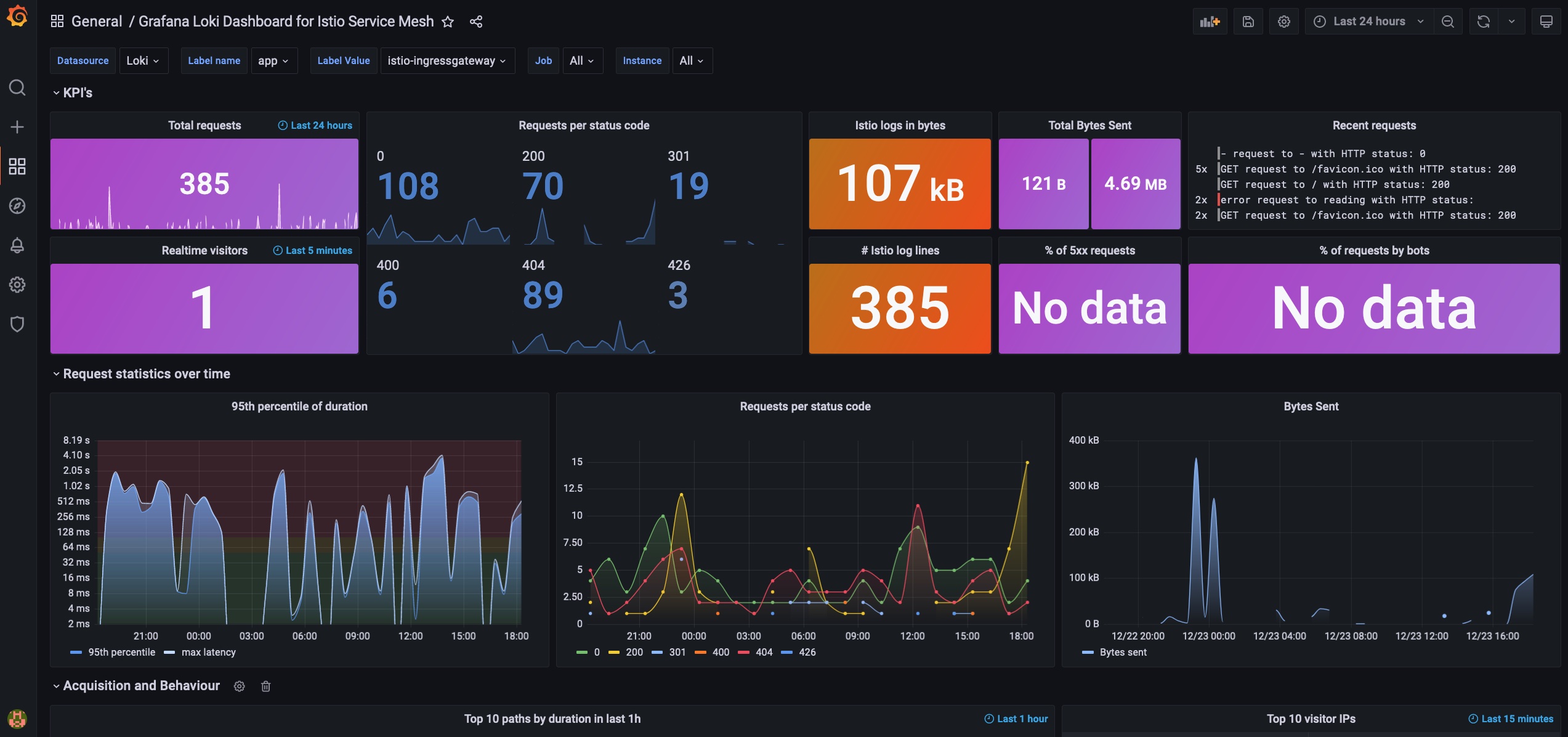 This dashboard is based on Envoy's (Istio's) access logs, parsed by Grafana Loki.
