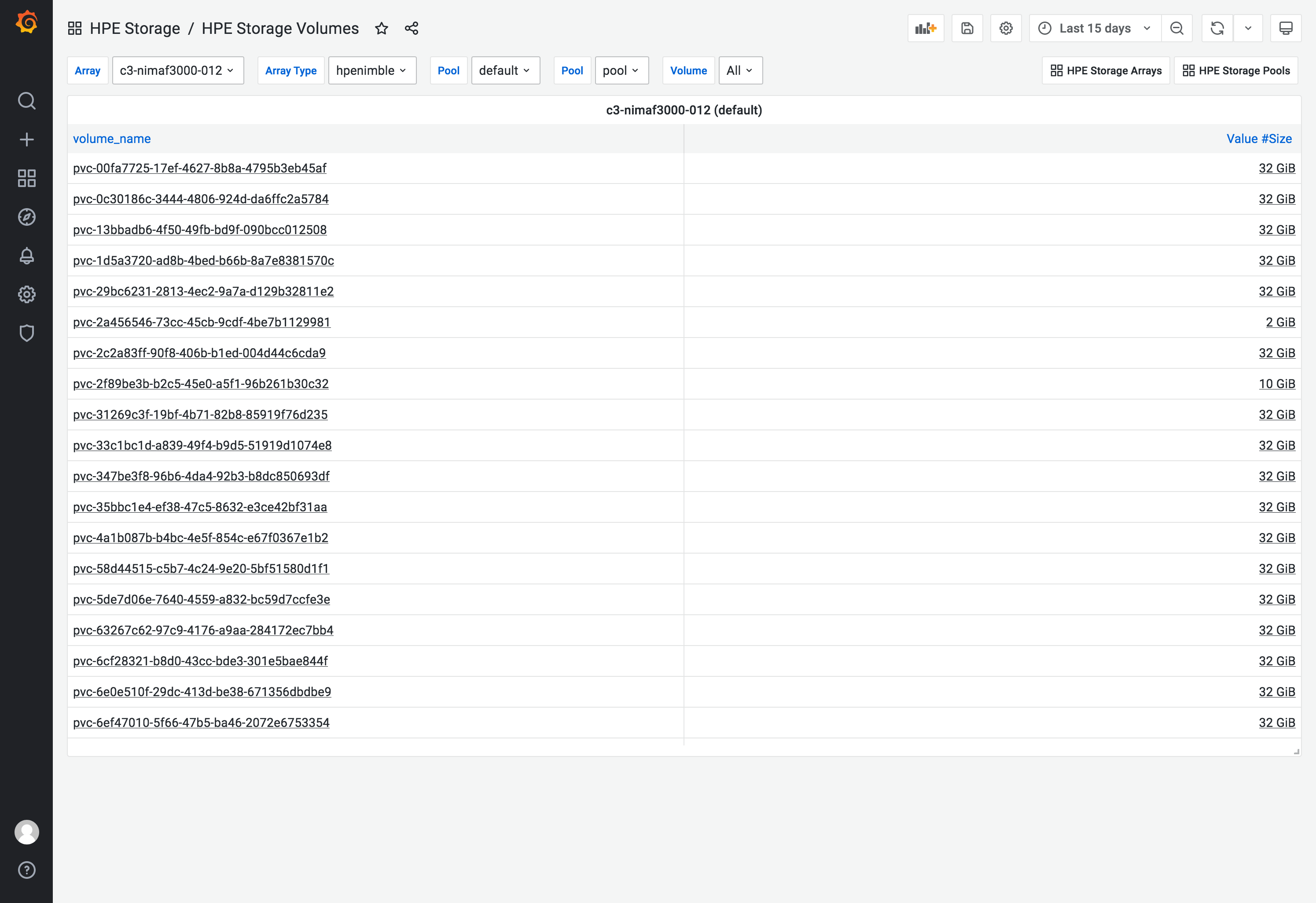 This dashboard enumerates volumes found in particular pool or CPG found in the datasource using a HPE Storage Array Exporter for Prometheus scrape target.
