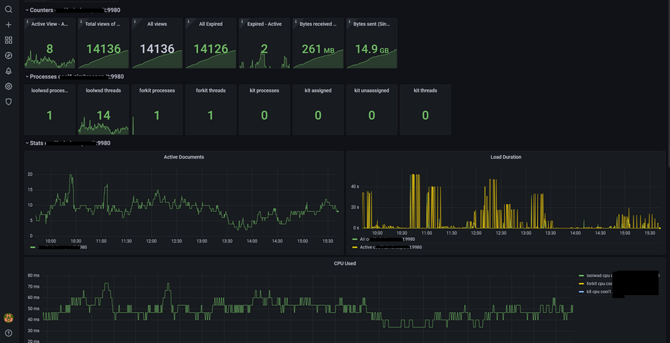 The Libreoffice Collabora dashboard uses the prometheus data source to create a Grafana dashboard with the stat and timeseries panels.