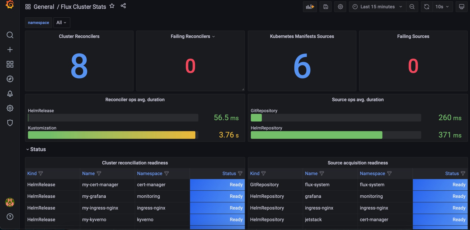 The Flux Cluster Stats dashboard uses the prometheus data source to create a Grafana dashboard with the bargauge, graph, stat and table panels.