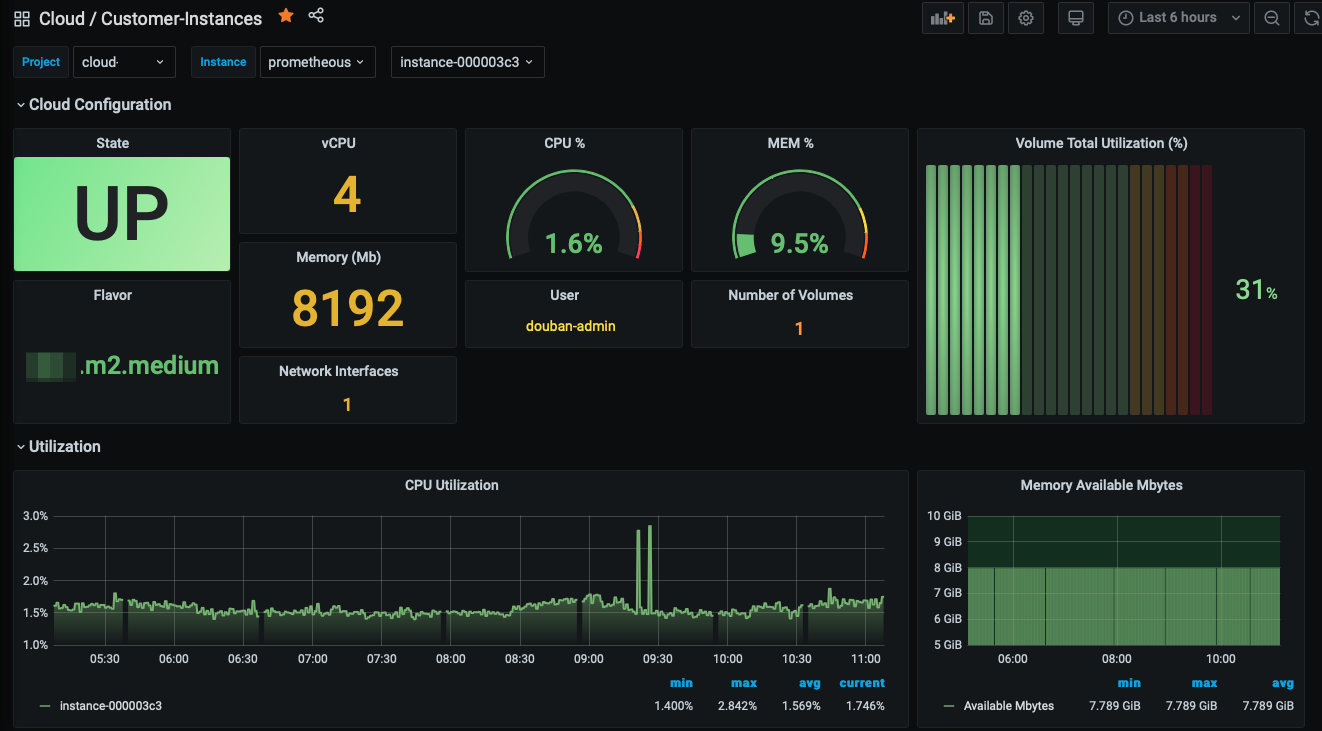 libvirt_exporter for displaying tenant Instance metric details https://github.com/AlexZzz/libvirt-exporter.git