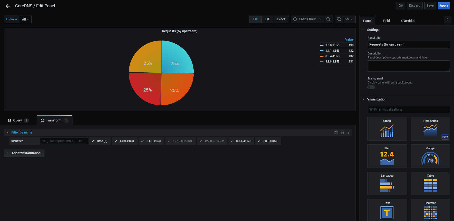 The "Requests (upstream)" piechart should be modified to fit your needs. Edit the panel, go to the "Transform" tab, and exclude (or re-include) any DNS servers from the pie chart that you wish. This is shown in the last screenshot.
