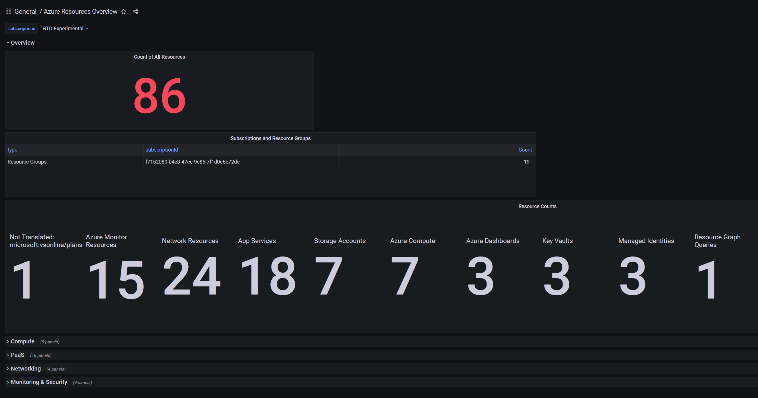The dashboard provides insights of Azure Resource Graph Explorer overview, compute, Paas, networking, monitoring and security. Queries used in this Azure Monitor dashboard we sourced from the [Azure Inventory Workbook](https://github.com/scautomation/Azure-Inventory-Workbook) by Billy York. You can find more sample Azure Resource Graph queries by Billy at this [GitHub](https://github.com/scautomation/AzureResourceGraph-Examples) repository.