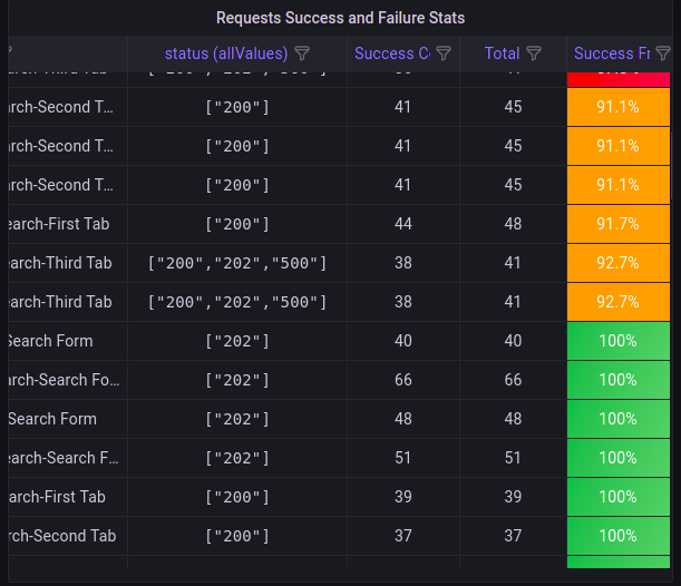 - "Requests Success and Failure Stats" table to track success and failed endpoints with their status codes.