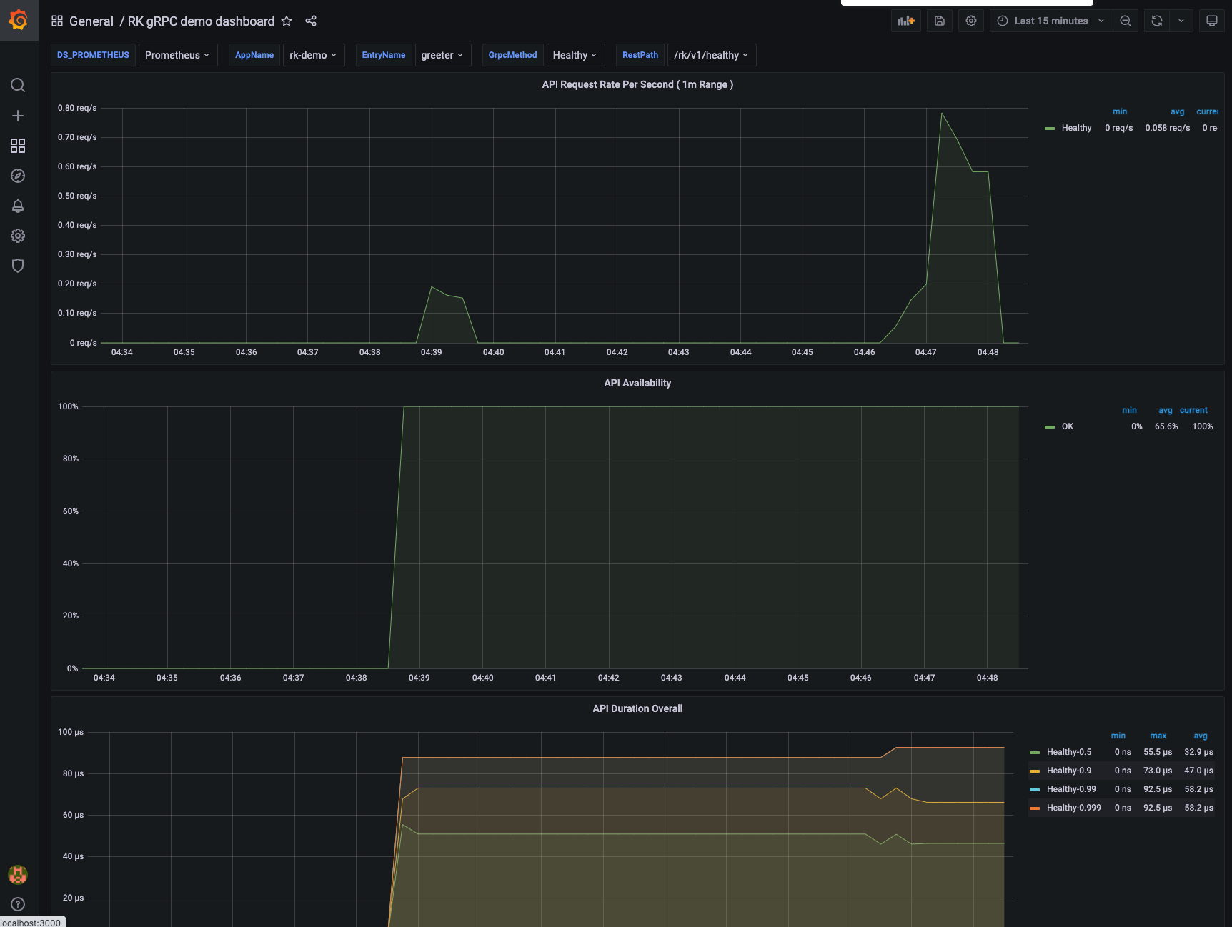 The RK prom dashboard uses the prometheus data source to create a Grafana dashboard with the piechart and timeseries panels.
