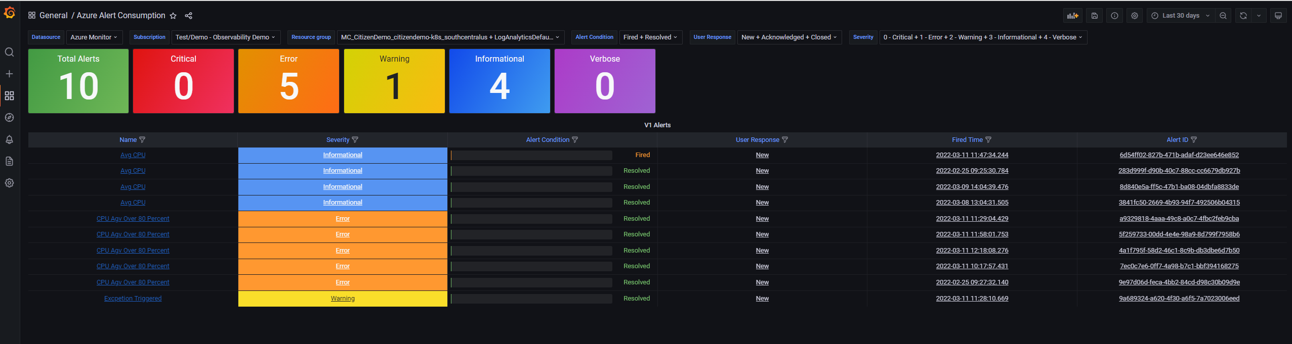 Using Azure Monitor data source, this dashboard helps you visualize an overview of all Azure alerts that were fired for the specified resource group/s. The table shows key details like Severity, Monitor condition, Alert state, Affected resource among others. Data can also be filtered on multiple columns allowing you to narrow the type of alerts displayed.