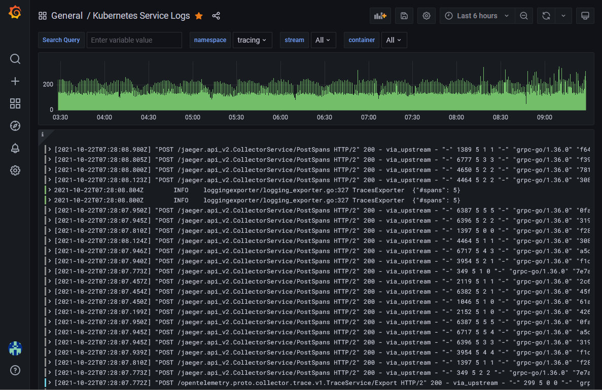 Dashboard for showing logs from Kubernetes in Loki. Has filters for namespace, container and stream.