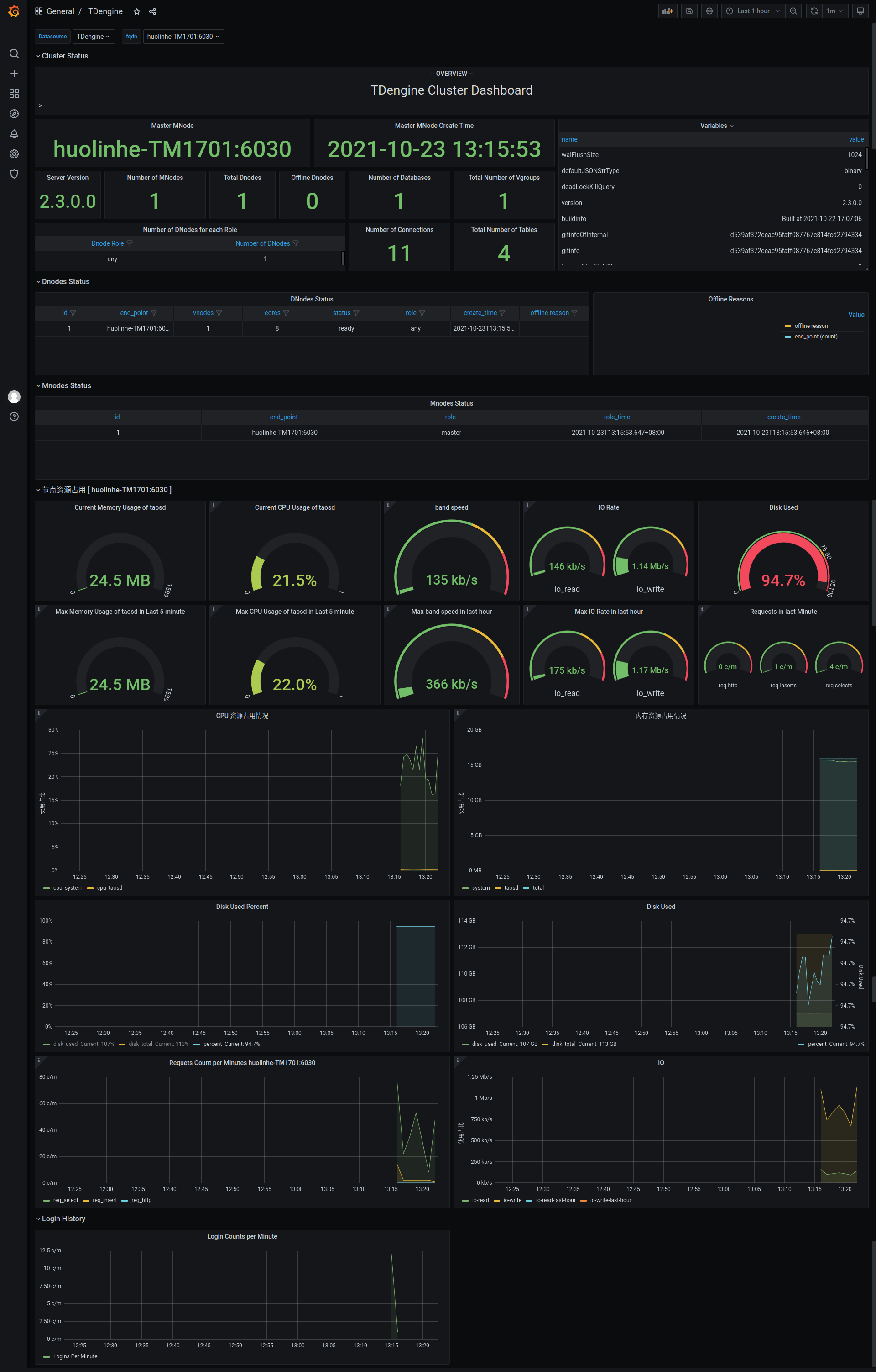 The Multiple TDengines Monitoring dashboard uses the tdengine-datasource data source to create a Grafana dashboard with the gauge, graph, piechart, stat, table and text panels.