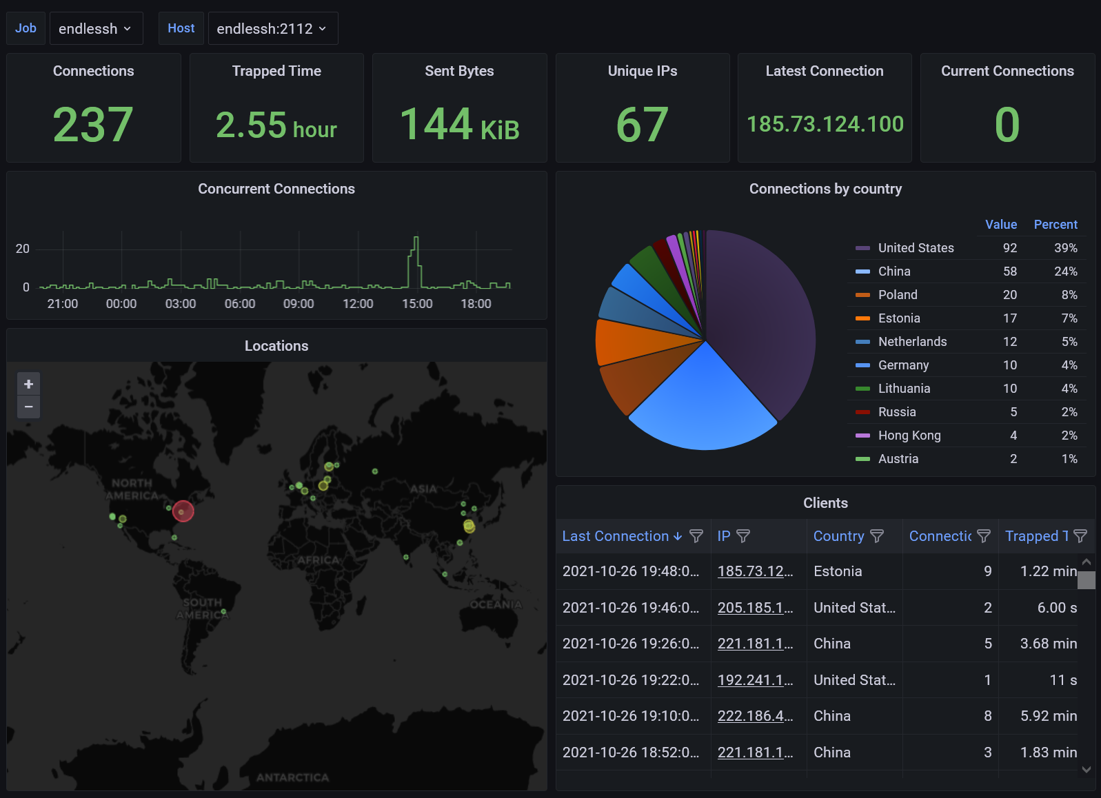 This dashboard reads metrics from the Golang implementation of endlessh, and visualize the sources of attacks for the selected time range.