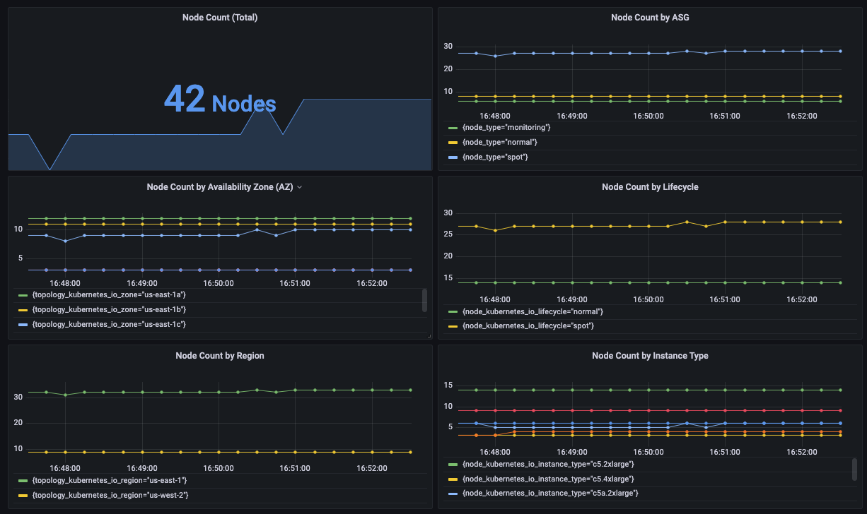 Uses Prometheus node metrics to visualize node distribution by region, AZ, instance type, ASG, Lifecycle (spot vs OD), etc.