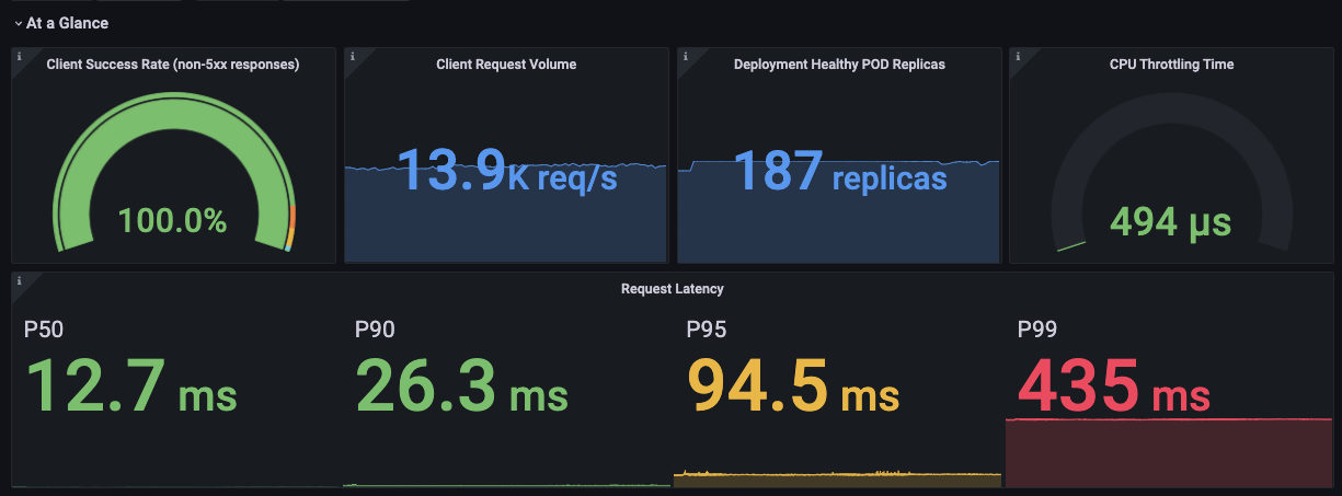 - At a Glance - A quick view of the health of your Kubernetes-based app (assumes it's web service, so it's mostly Istio metrics like success, latency, etc)