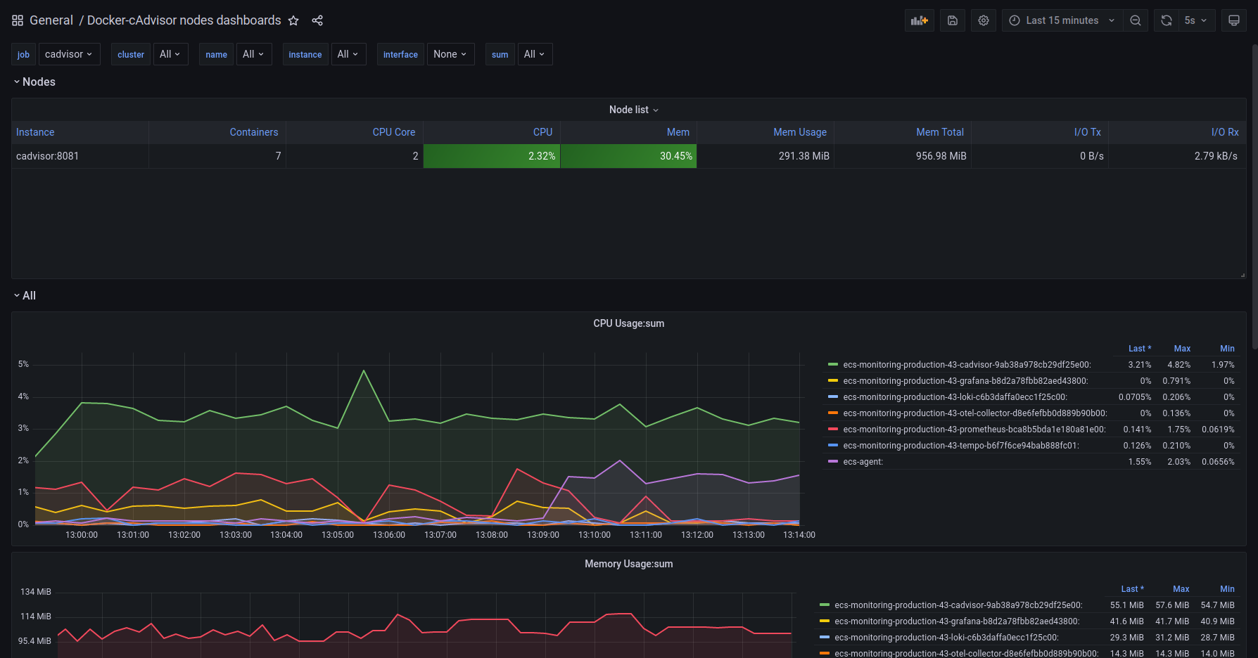 This dashboard will show cAdvisor metrics collected from Prometheus. The dashboard can be filtered by cluster name that is coming from AWS ECS and also by instance and job.