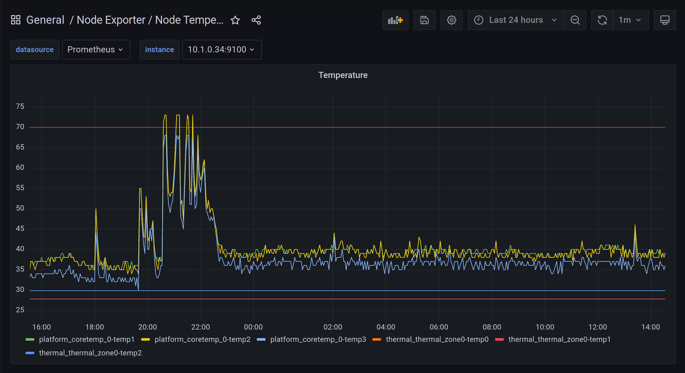 The Node Exporter / Node Temperatures dashboard uses the prometheus data source to create a Grafana dashboard with the timeseries panel.