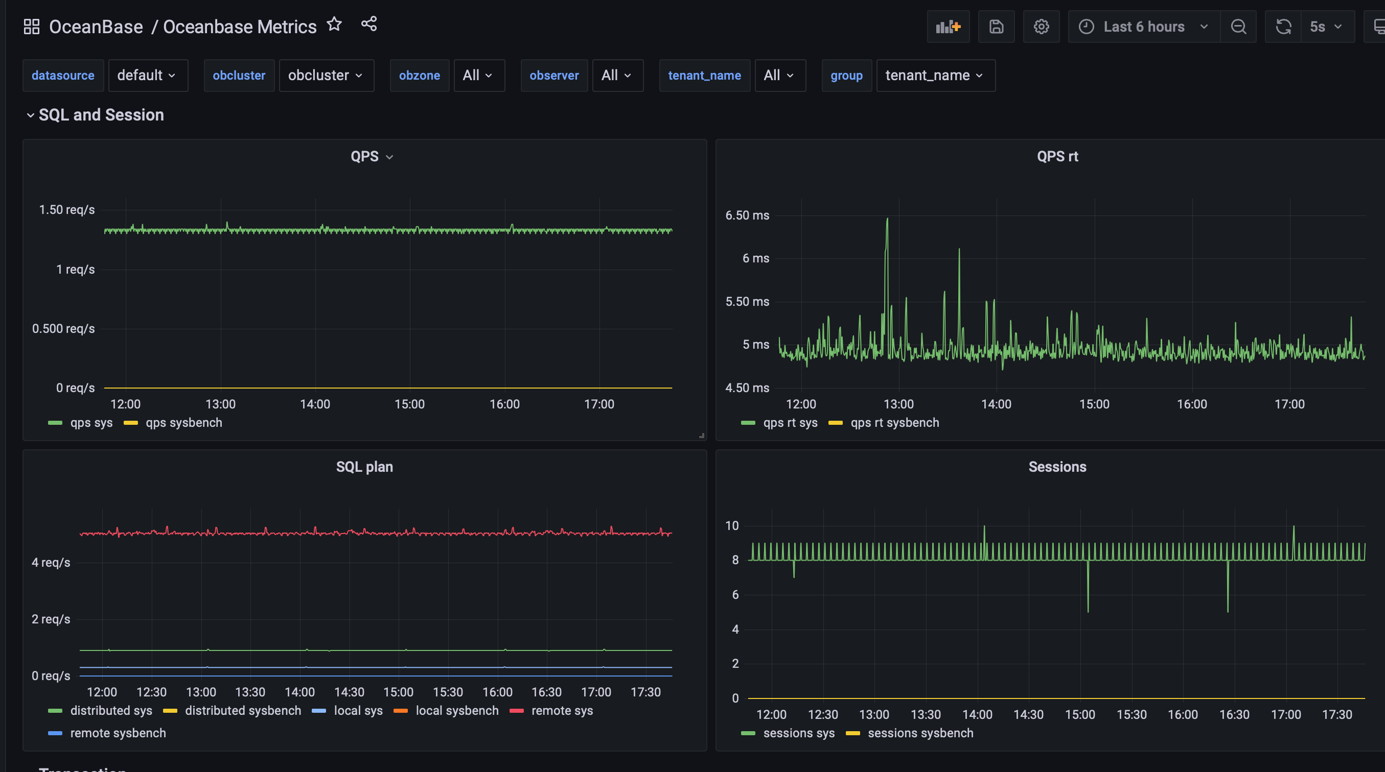 The OceanBase Metrics dashboard uses the prometheus data source to create a Grafana dashboard with the timeseries panel.