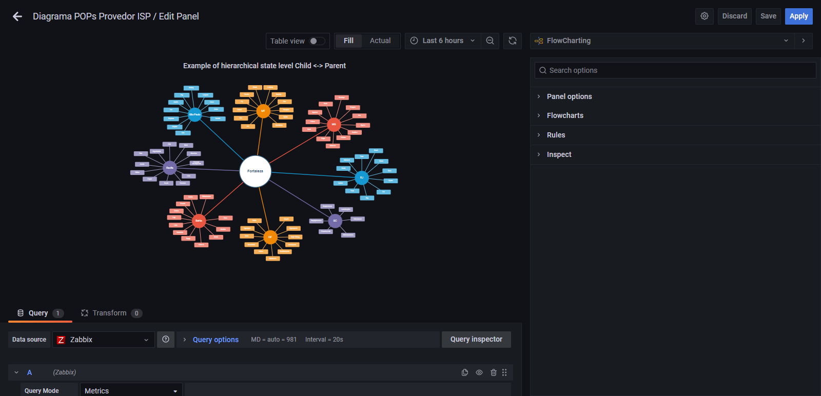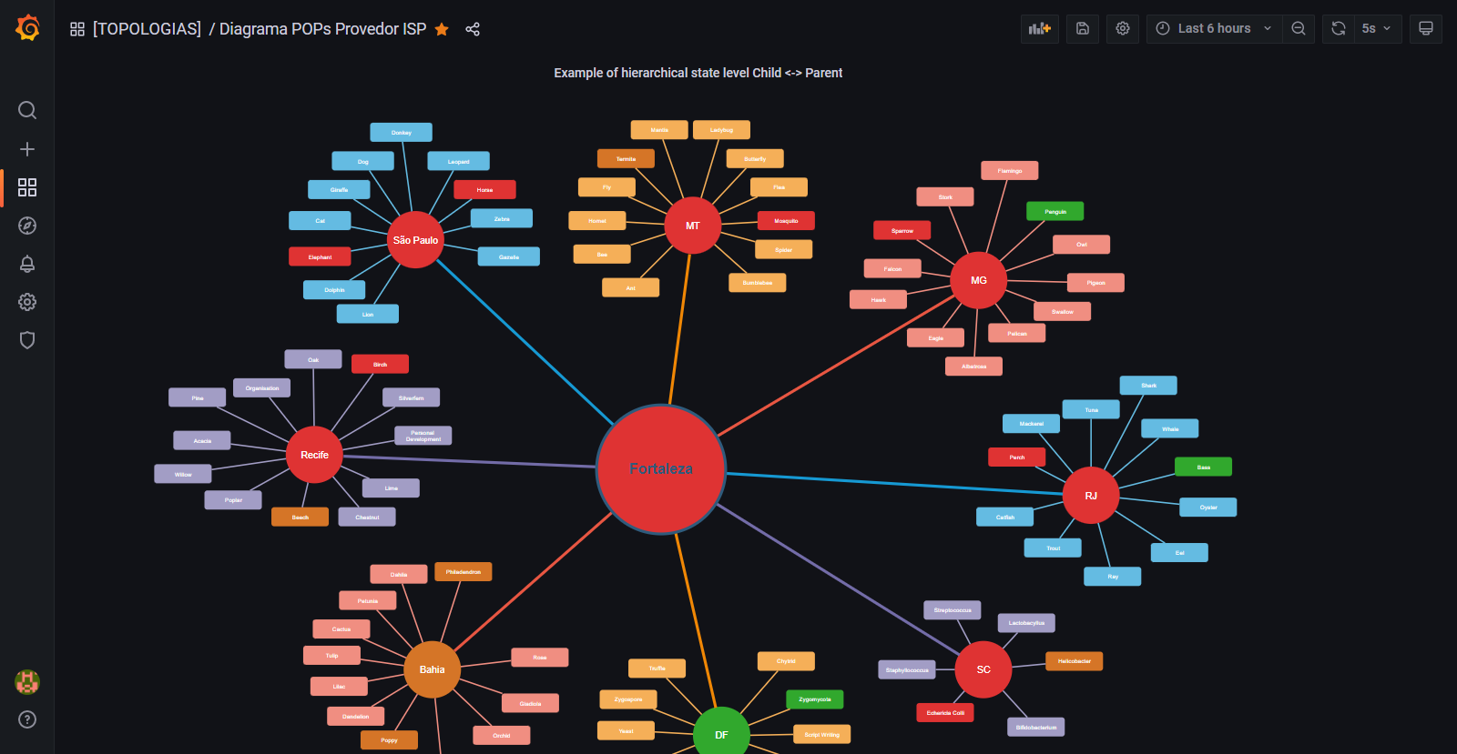 O trampo foi para um provedor de internet ISP ( Internet Service Provider ). Neste dashboard temos o "monitoramento" em Real Time de vários Estados e suas respectivas Cidades atendidas. Aqui usei o Visualizador de métricas Grafana, Datasource Zabbix e Plugin Flowcharting, todos em suas ultimas versões estáveis. Temos interação com animações na Topologia como por ex: