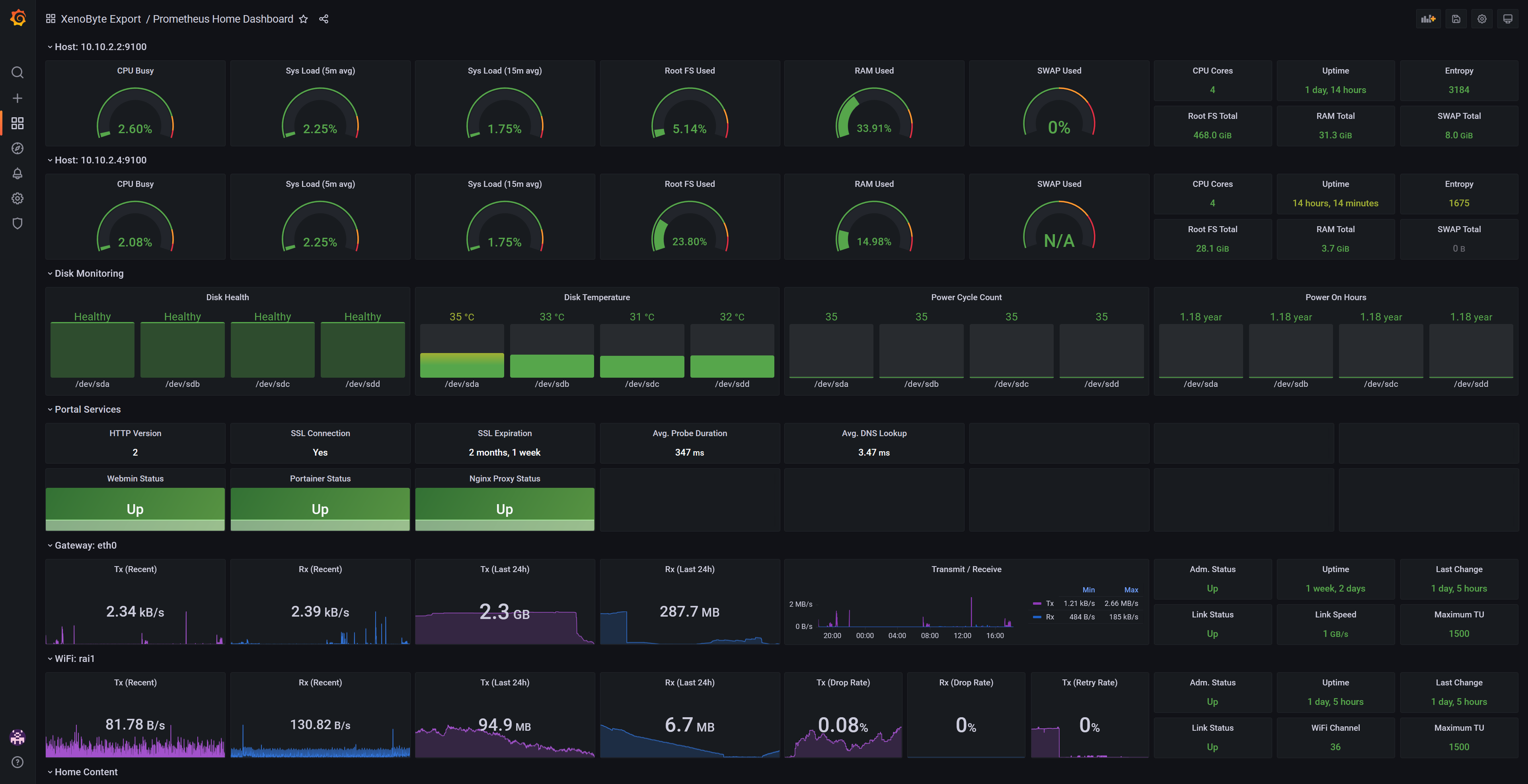 This dashboard gives a quick overview of your hosts, disk monitoring, web services and network (Gateway and Unifi AP's). This is a mashup of my 3 other dashboards.