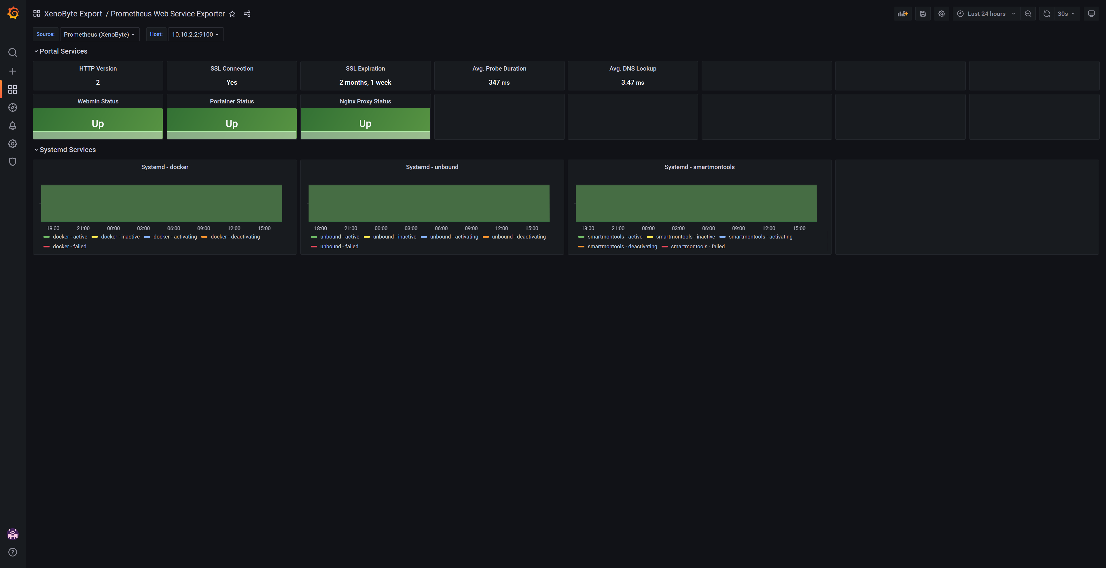 This dashboard gives an overview of HTTP stats and selected web services (from Blackbox Exporter), as well as status for selected systemd services (from Node Exporter).