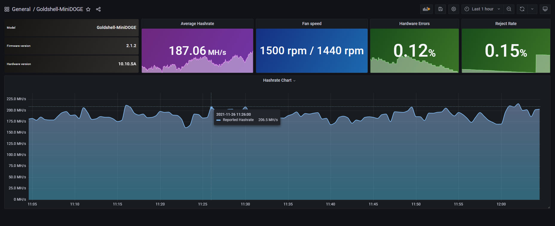 This project queries the public, and available Goldshell API, based on cgminer, to obtain useful data about our ASIC Miner, using native telegraf, sending the data to InfluxDB, and finally showing it on Grafana.