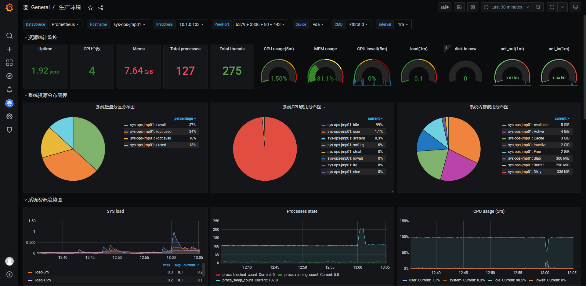 The Prometheus-主机监控 dashboard uses the prometheus data source to create a Grafana dashboard with the grafana-piechart-panel, graph, singlestat and stat panels.