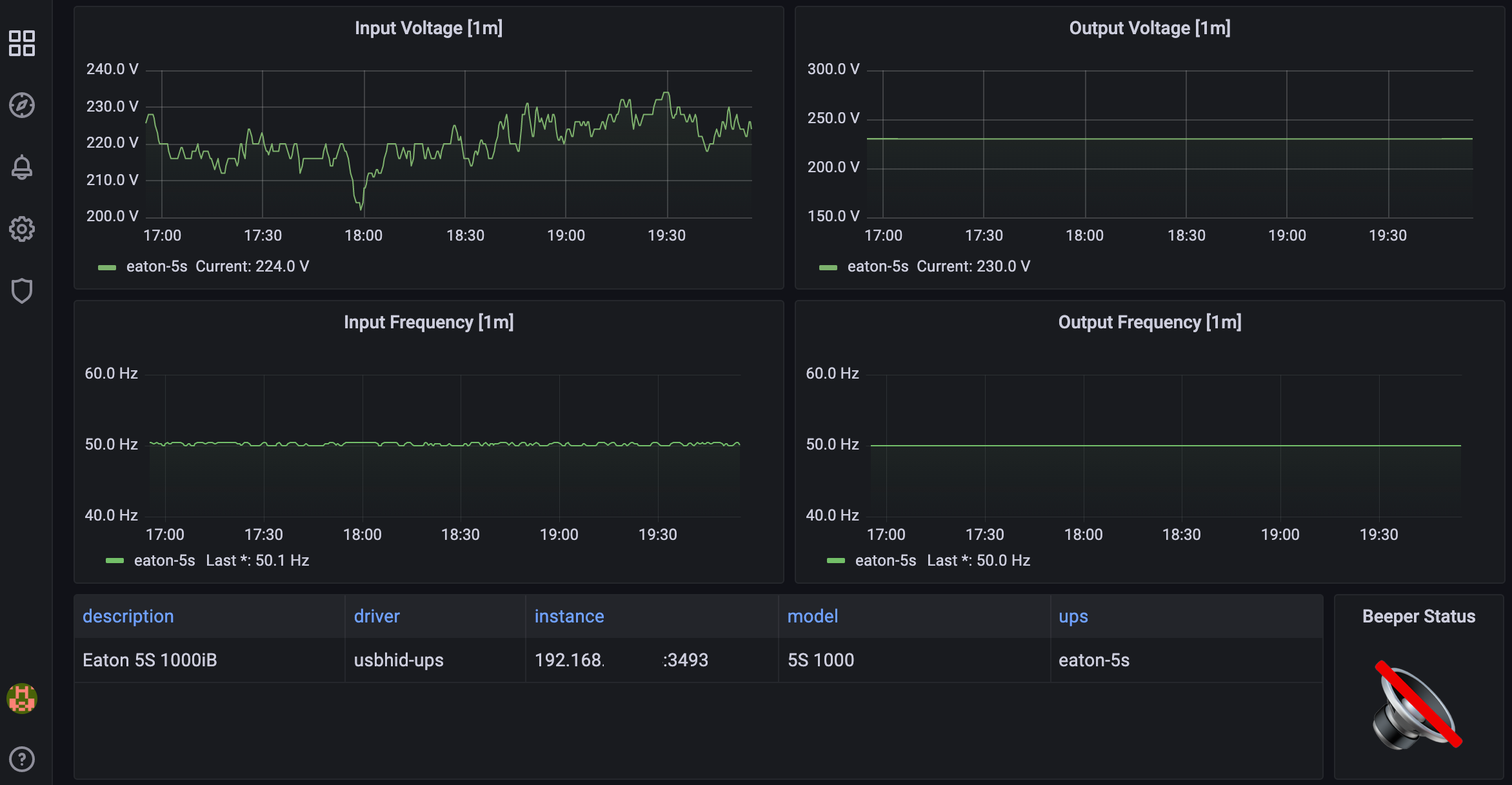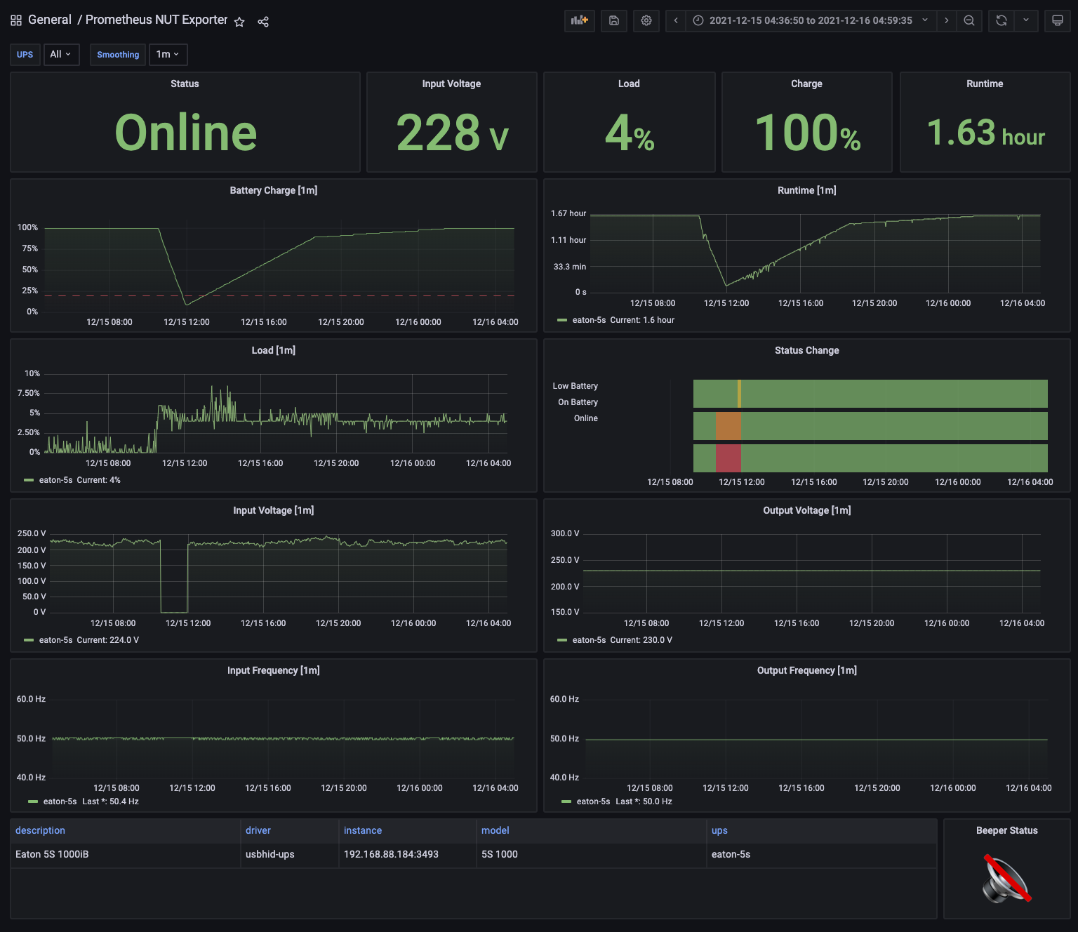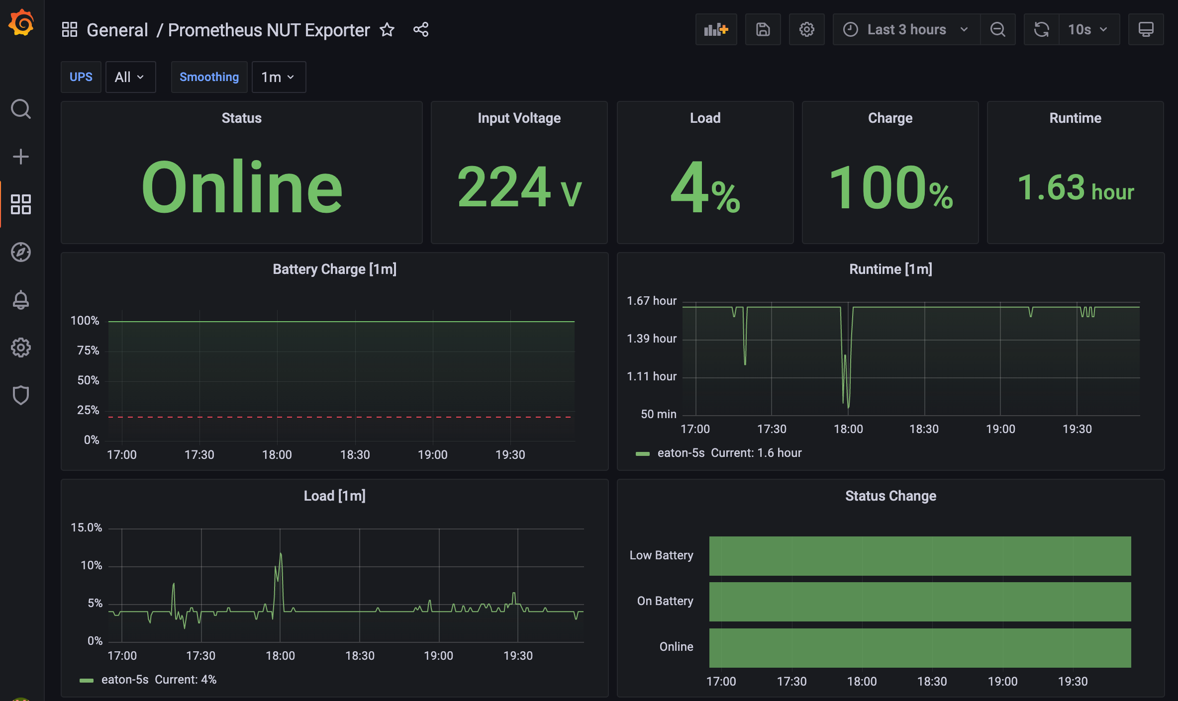 A dashboard to visualize statistics from a single UPS. I've optimized it for the Eaton 5S series, but it would theoretically work with anything compatible. Adjust statuses for your UPS in the mapping of "Status" and "Status Change" panels and enjoy the feeling of control. :)