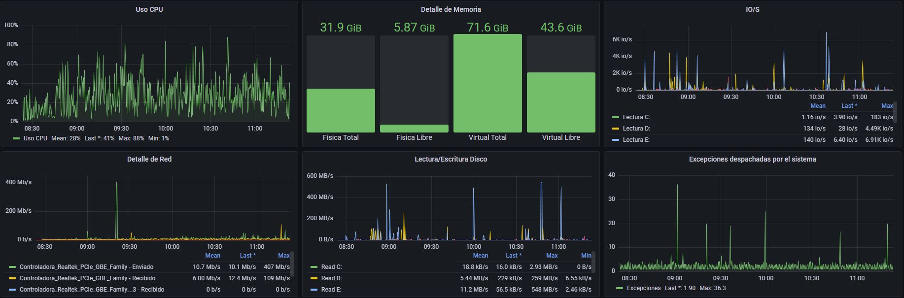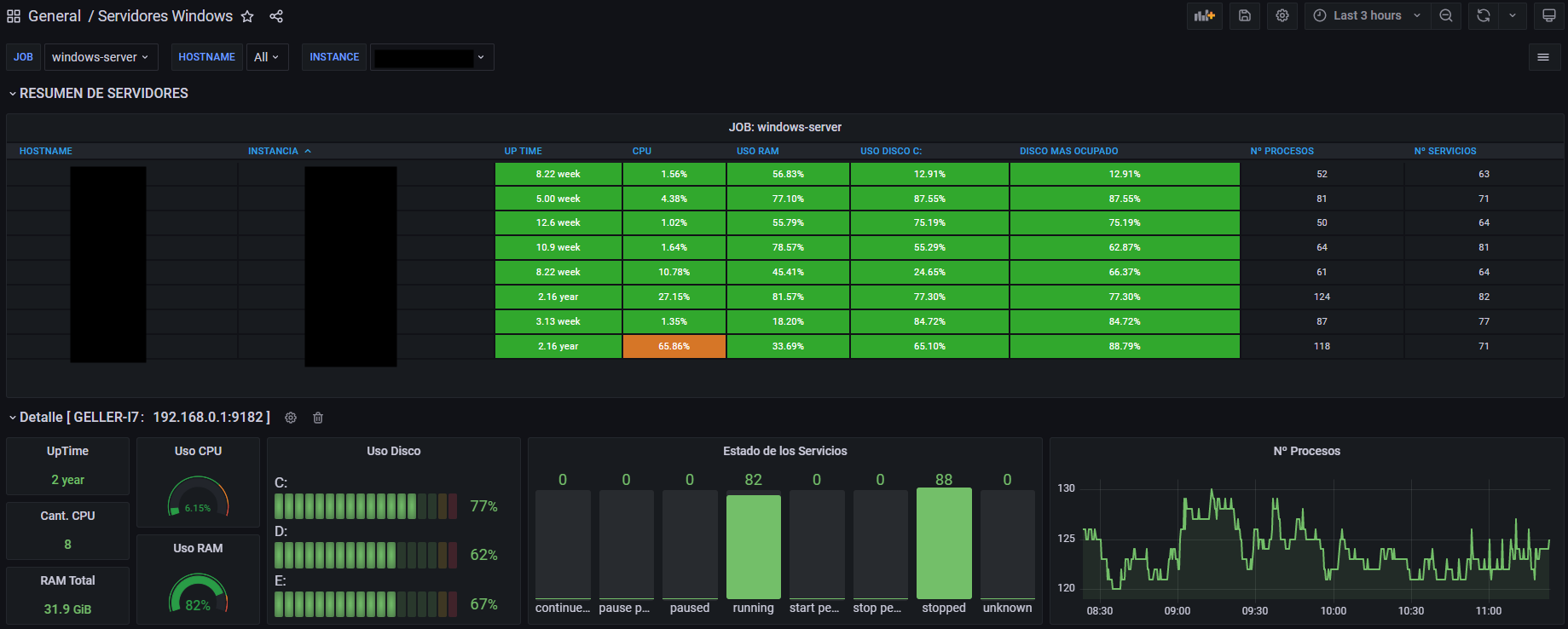 Dashboard para monitorear servidores y equipos Windows 10, 2012 R y 2016. En Español. Basado en: https://grafana.com/grafana/dashboards/10467