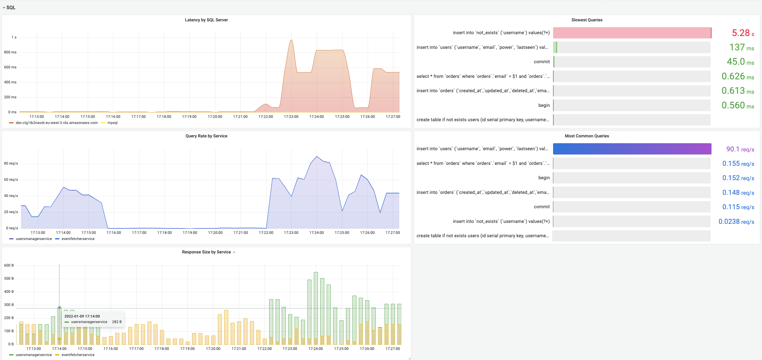 The PromQL Onboarding Dashboard dashboard uses the postgres and prometheus data sources to create a Grafana dashboard with the bargauge, piechart, stat and timeseries panels.