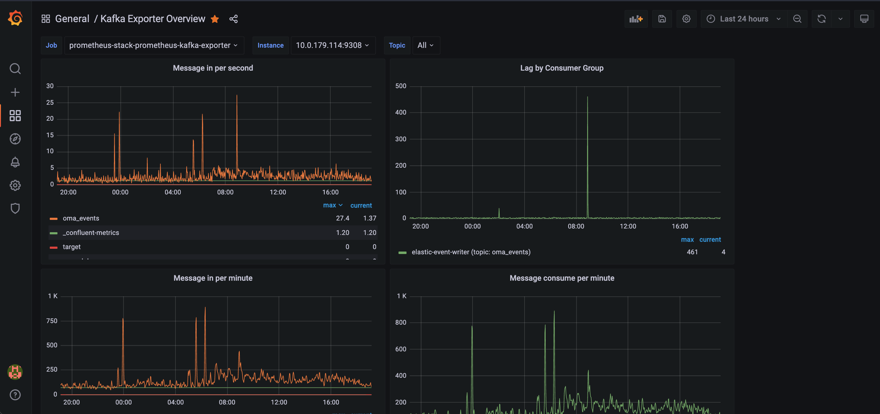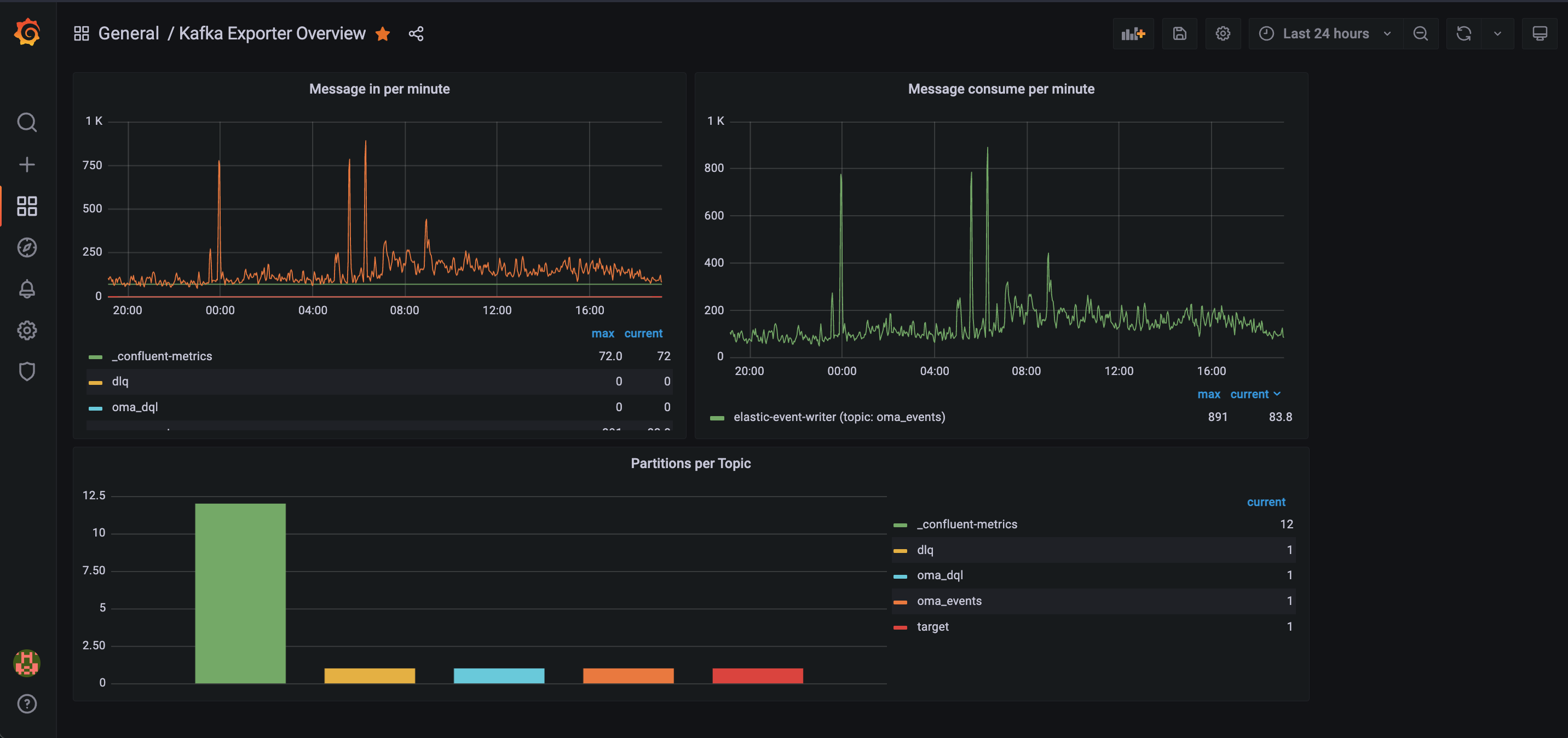 Displays Kafka metrics created by the exporter.