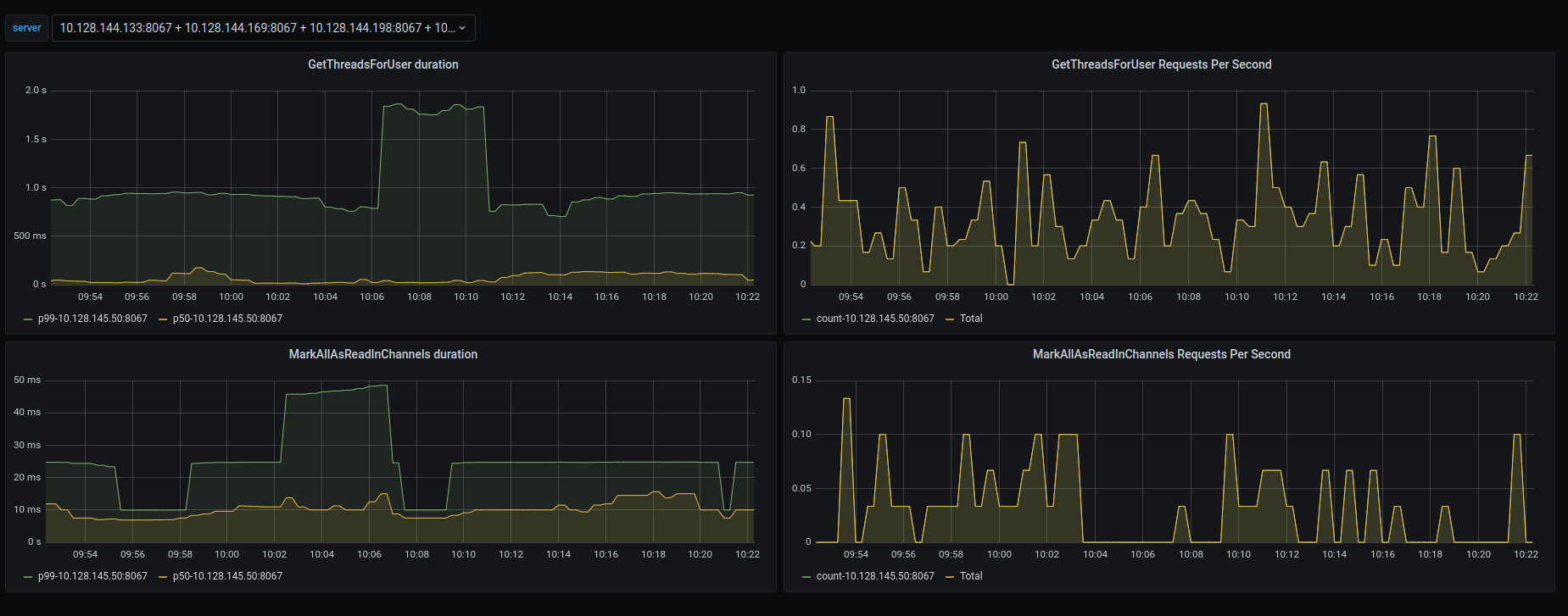The dashboard provides rate and duration graphs for both of these. Any sudden spikes in any of these can indicate a drop in performance.