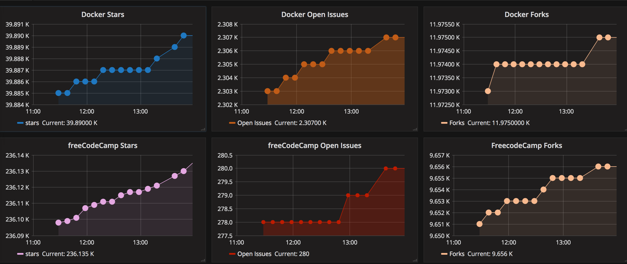 The Grafana Dashboard tracks GitHub Repo Stars, Forks, and issues related to each Repo. The project is easy to update to track different Repos. The Dashboard is intented to be a starting point for your projects.