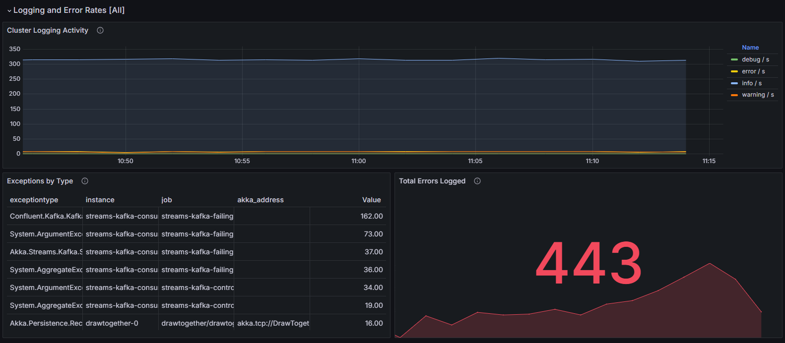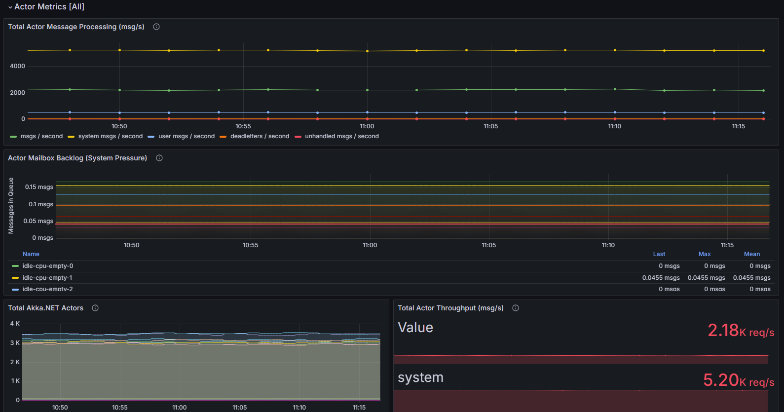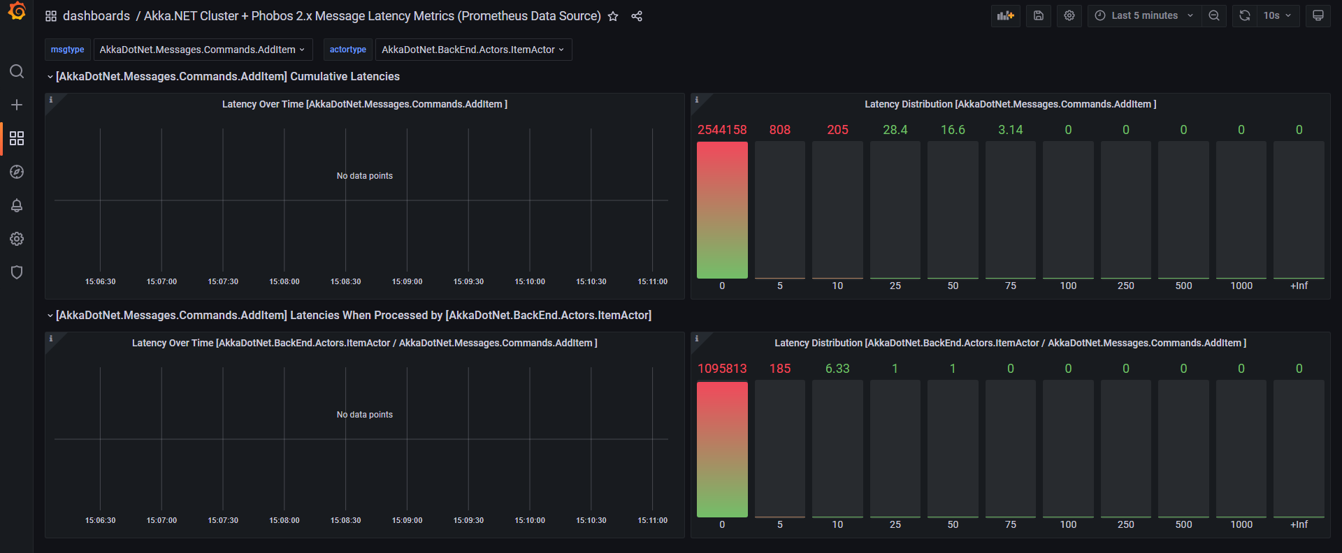 This dashboard is used to visualize detailed Akka.NET message-processing latency figures. It can work with or without Akka.Cluster deployment.