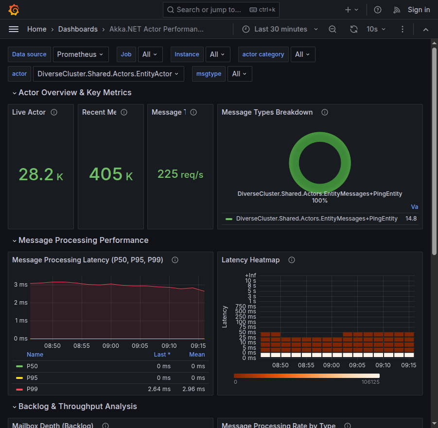 It's designed to consume data from the Phobos Akka.NET APM library and will automatically format the data produced natively by Phobos into the charts without any additional effort. All this dashboard requires is a Prometheus instance that is accessible via Grafana and Phobos.