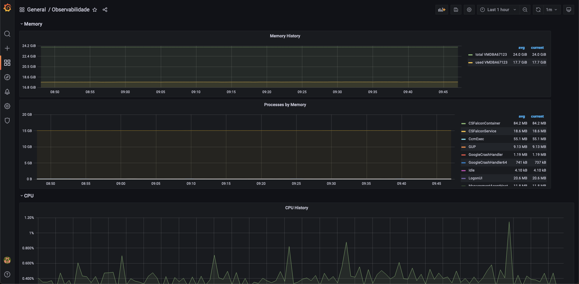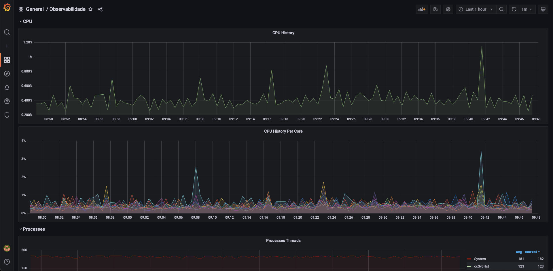 O dashboard Observabilidade - Protheus Enfironment (Hosts), fornece uma visão geral das maquinas, é uma visão genérica que monitora os principais recursos.