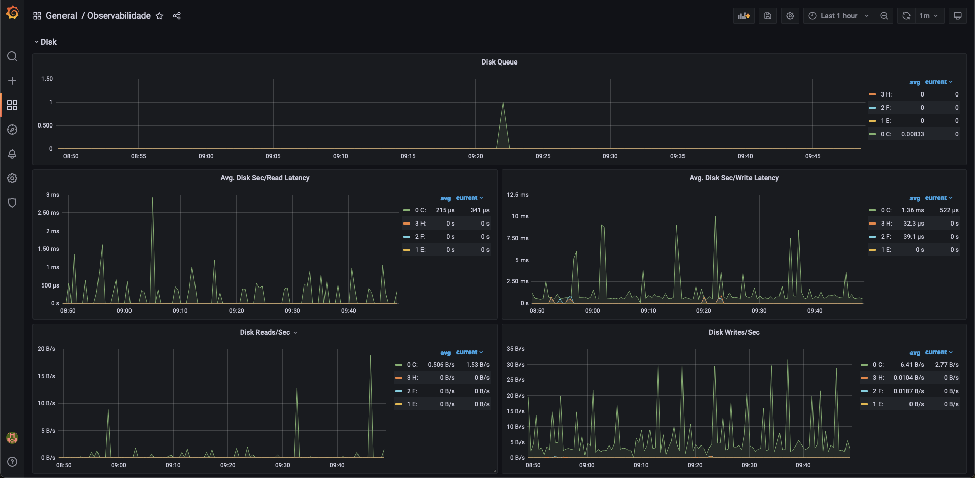 Tempo médio de latencia de cada disco na leitura e escrita (Avg. Disk Sec/Read Latency e Avg. Disk Sec/Write Latency);