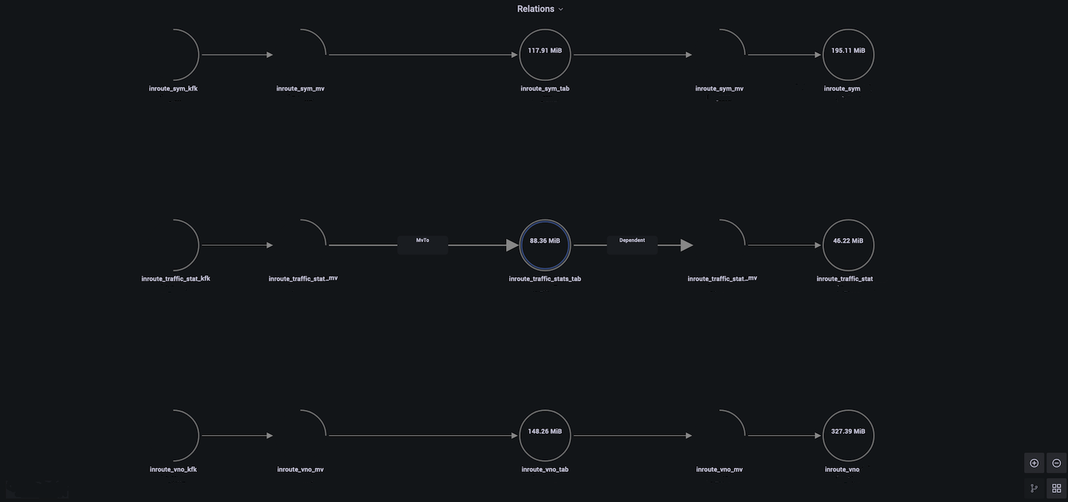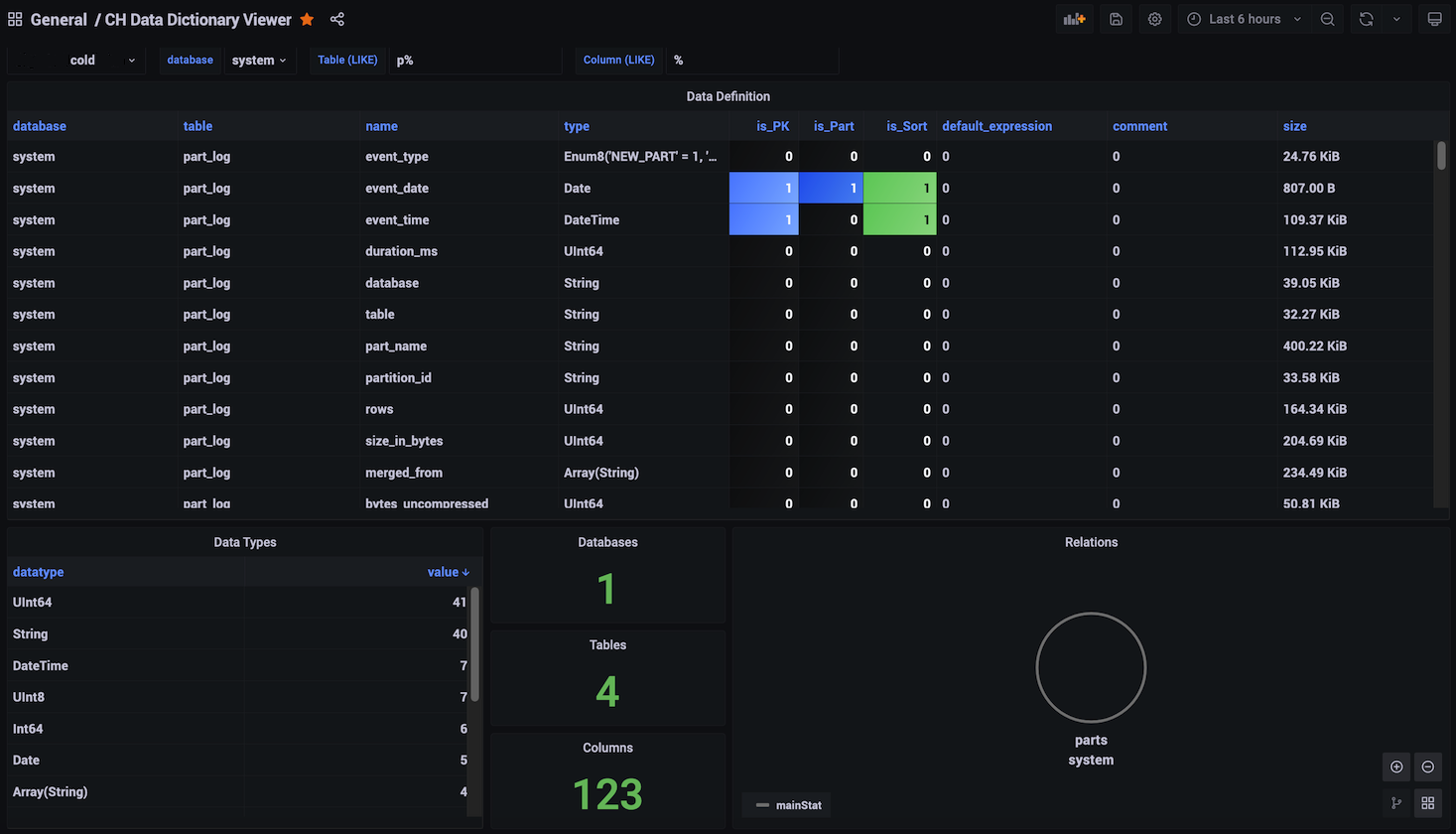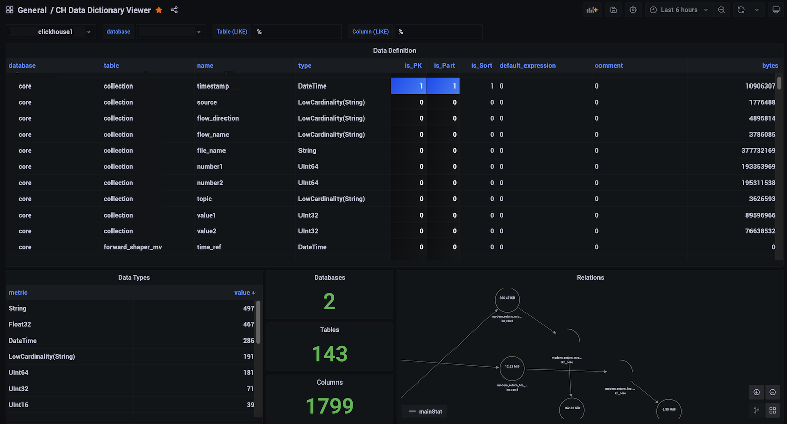 The dashboard shows columns attributes, most used data types and a graph with relationships between tables (eg. materialized views moving data from a Kafka Engine table to a MergeTree table). You can choose databases, tables and columns to be shown using variables. This dashboard does not require any data collection since it uses the standard data dictionary tables in the system database.