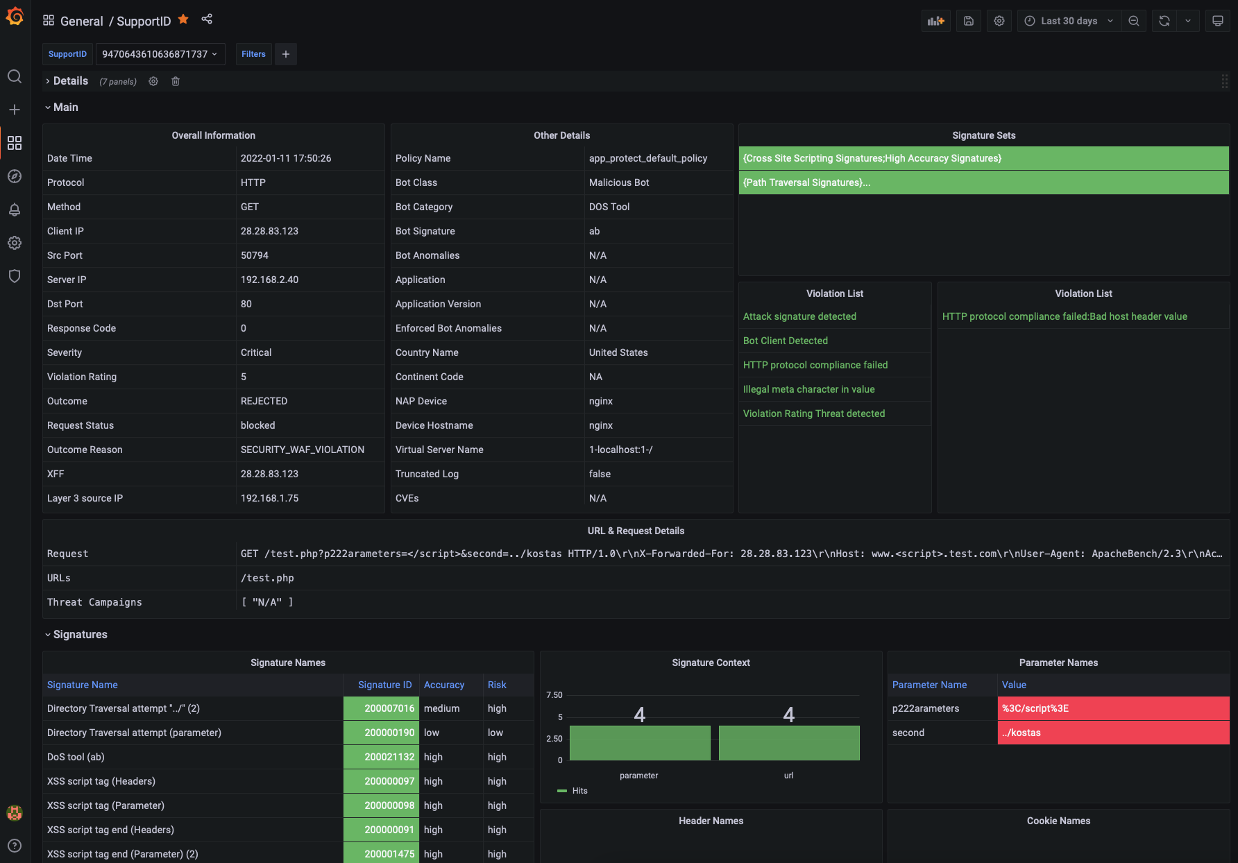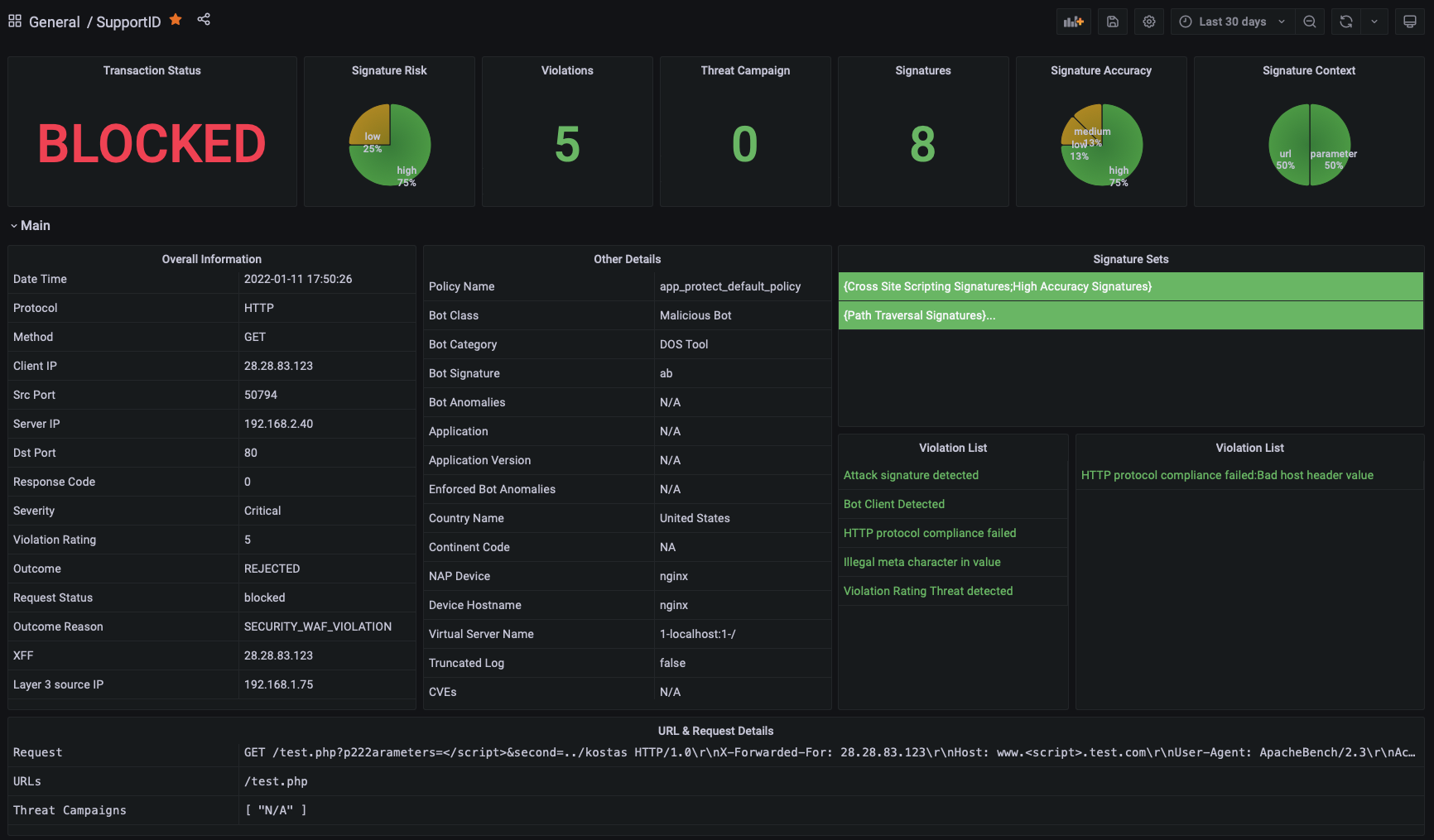This Dashboard provides more visibility into a single incident logged by NGINX App Protect. This is part of a series of NGINX App Protect Dashboards