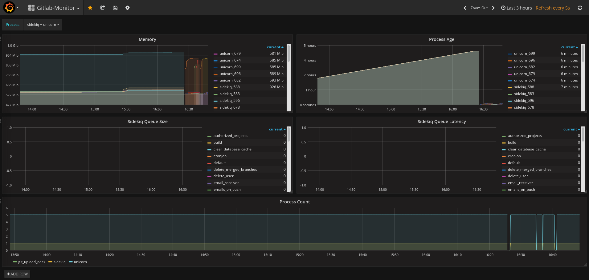 Monitor Gitlab: Memory, Process-Age, Sidekiq queue/Latency, Process Count